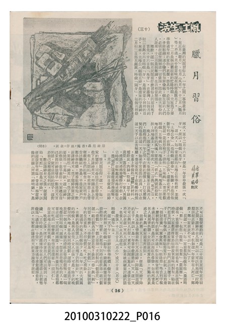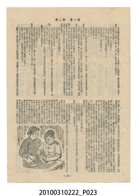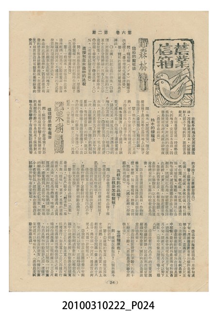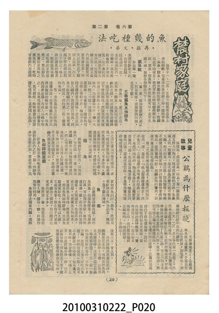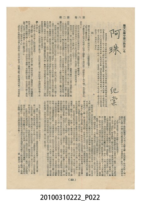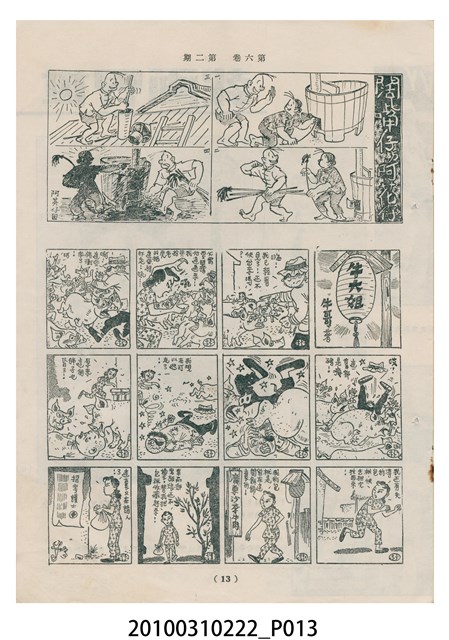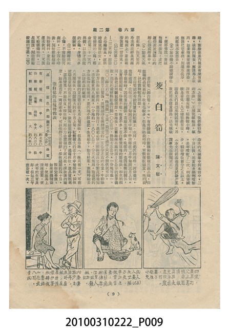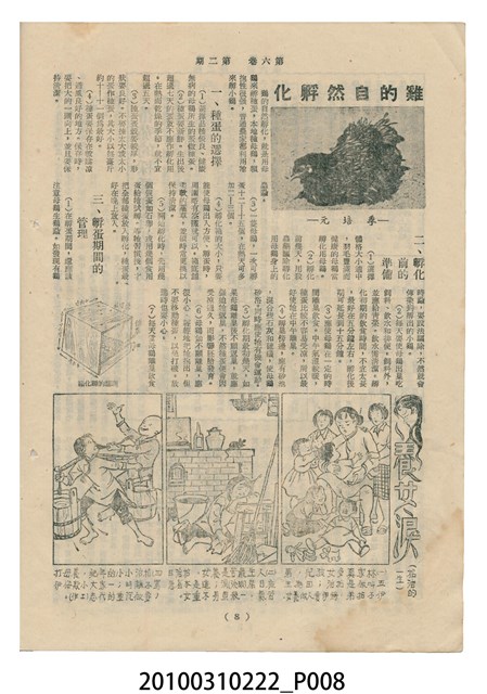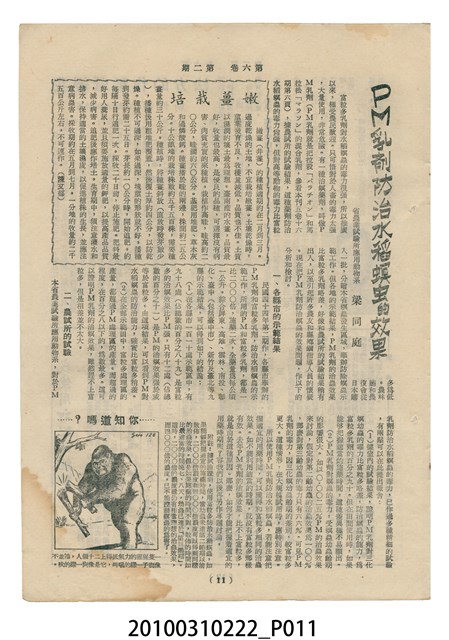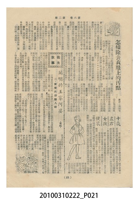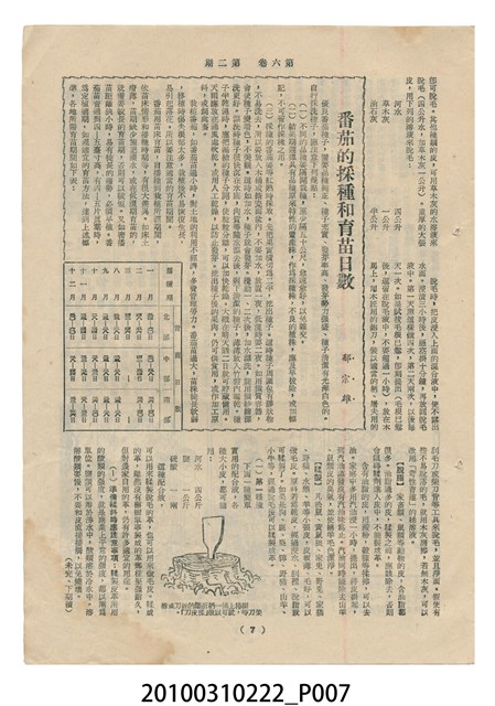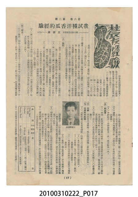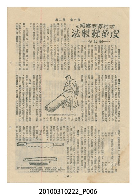 1.本物件為《豐年》雜誌第6卷第2期。封面、封底均用彩色印刷。封面以楊基炘所攝的「洪明秀小姐戲裝」為底圖。左上部印期刊名緊接著由右至左印「農民之友 生產之道」字樣,右下部由右而左橫印「第六卷第2期」,正下緣由右而左橫印「中華民國四十五年一月十六日」。封底左半部載定價及登記、發行、印刷等相關資訊,左上角印有豐年社的商標。內文第3頁右邊為目錄。收錄文章主要為與農畜業相關報導,此外,尚有牛哥漫畫、農村家庭、小說等專欄。