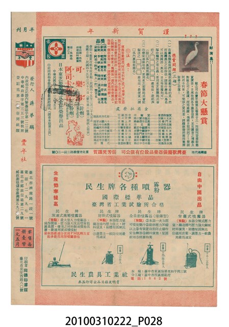 2.《豐年》雜誌是由豐年社所發行的刊物,豐年社成立於民國40年(1951),成立目的在發行銷售有關農業書刊、產品及資材,以服務農民、提高農家所得、改善農家生活。同年7月15日開始發行《豐年》半月刊,初期定位為專業性的農業雜誌,後為因應經濟結構及農村社會的改變,內容也隨之調整,收錄有關生活與生態問題之文章。民國106年(2017)9月,雜誌改為月刊,至今。