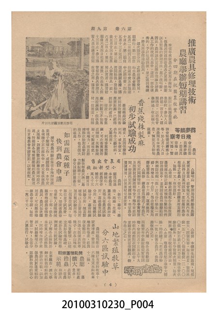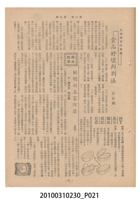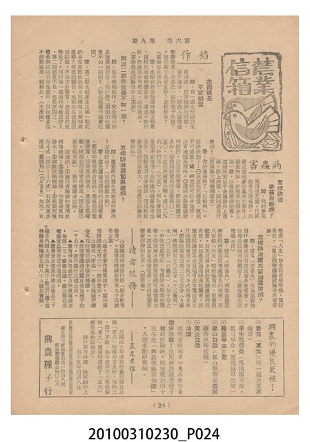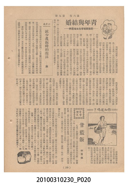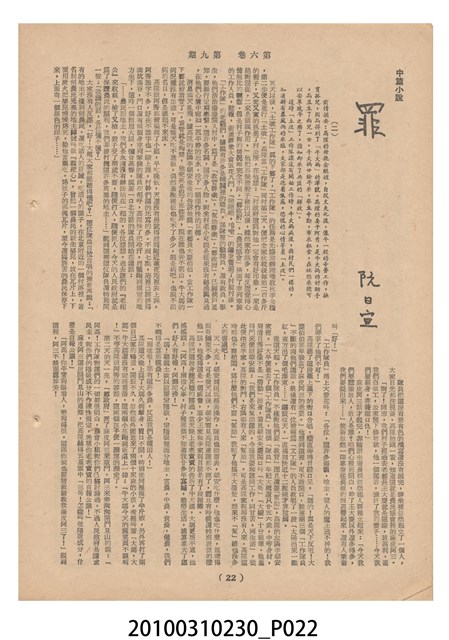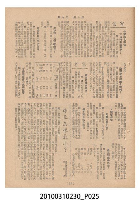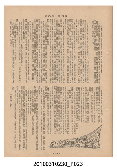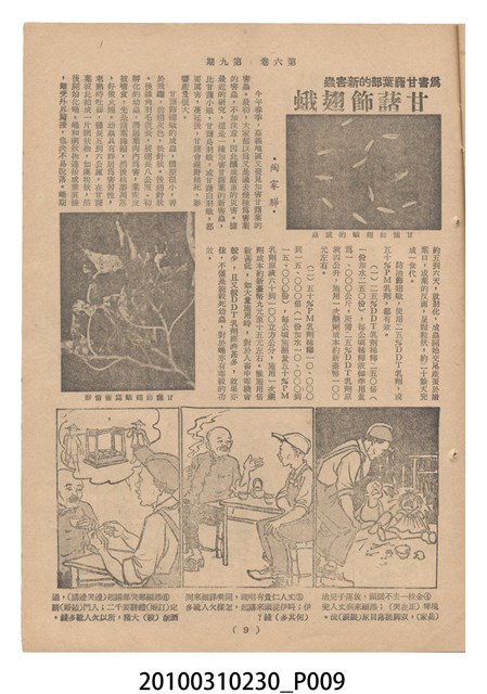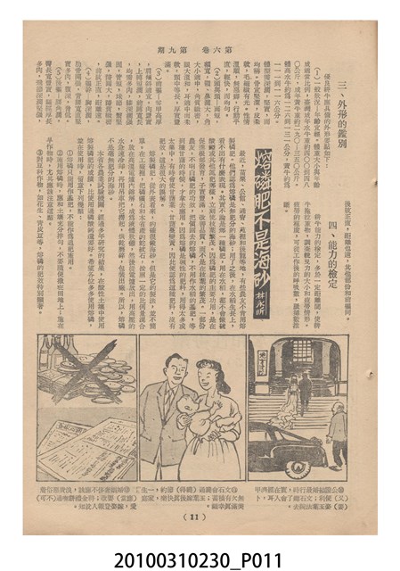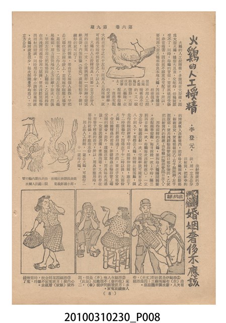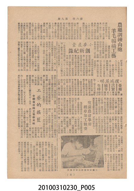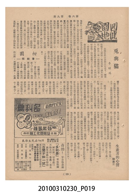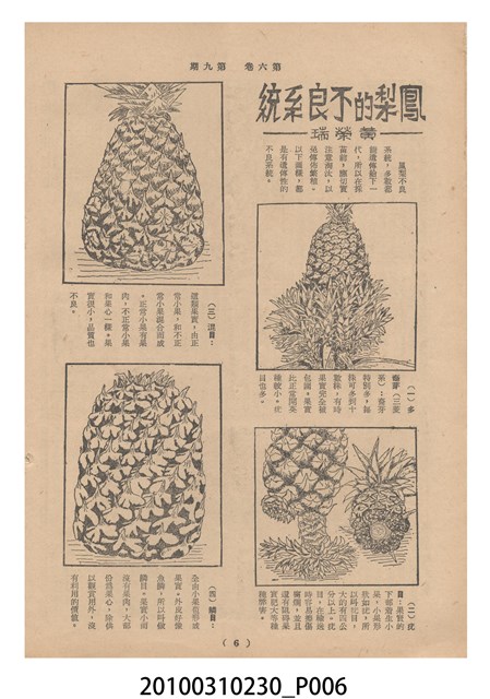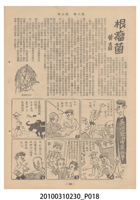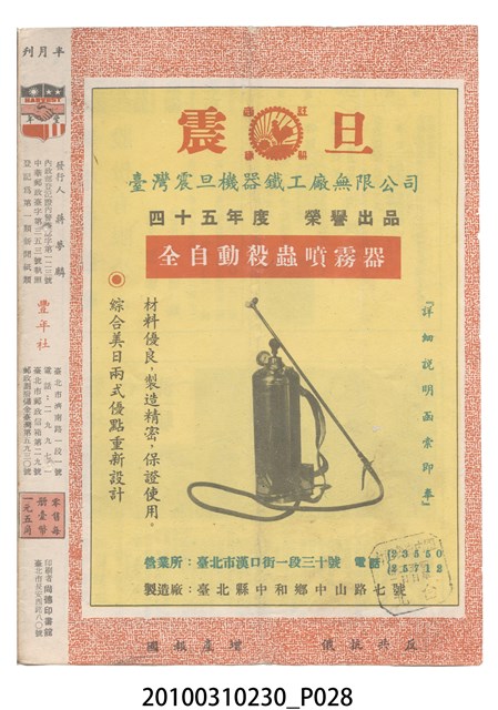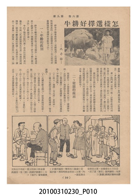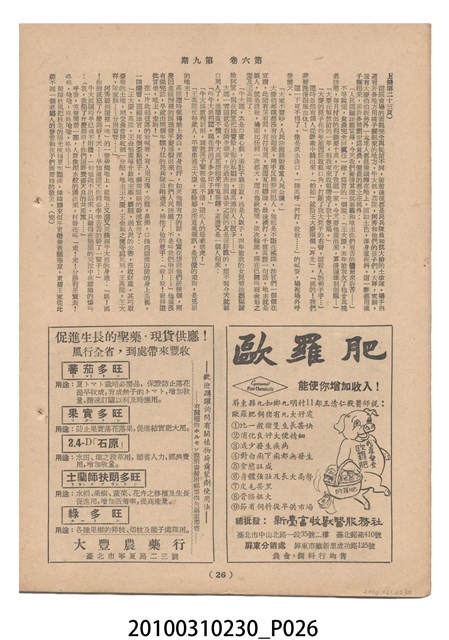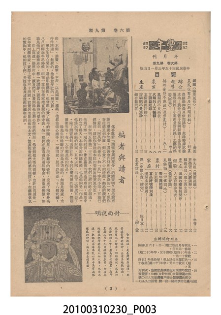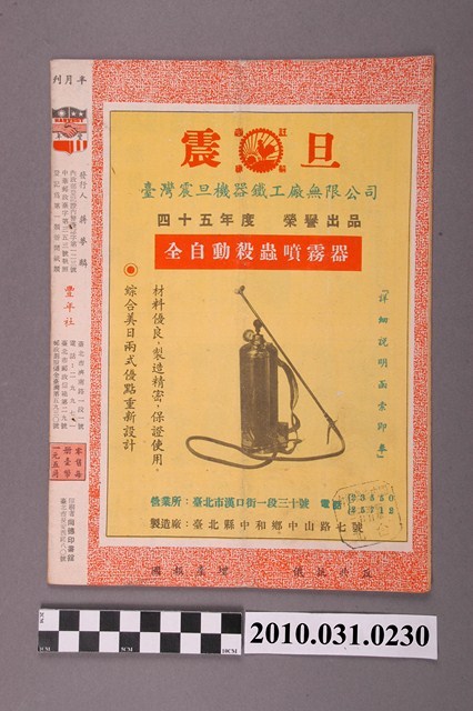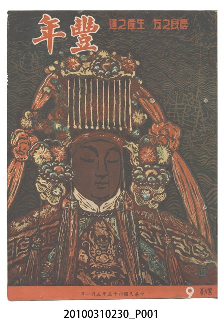 1.本物件為《豐年》雜誌第6卷第9期。封面、封底均用彩色印刷。封面以楊英風所作的「媽祖」為底圖。左上部印期刊名,接著由右至左印「農民之友 生產之道」字樣,右下部由右而左橫印「第六卷第9期」,正下緣由右而左橫印「中華民國四十五年五月一日」。封底左半部載定價及登記、發行、印刷等相關資訊,左上角印有豐年社的商標。內文第3頁右邊為目錄。收錄文章主要為與農畜業相關報導,此外,尚有牛哥漫畫、農村家庭、小說等專欄。