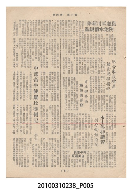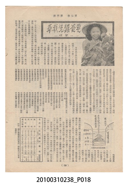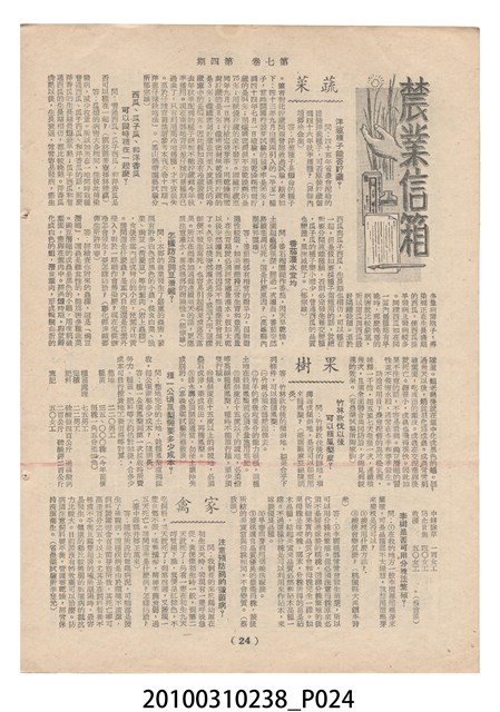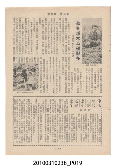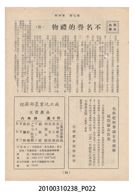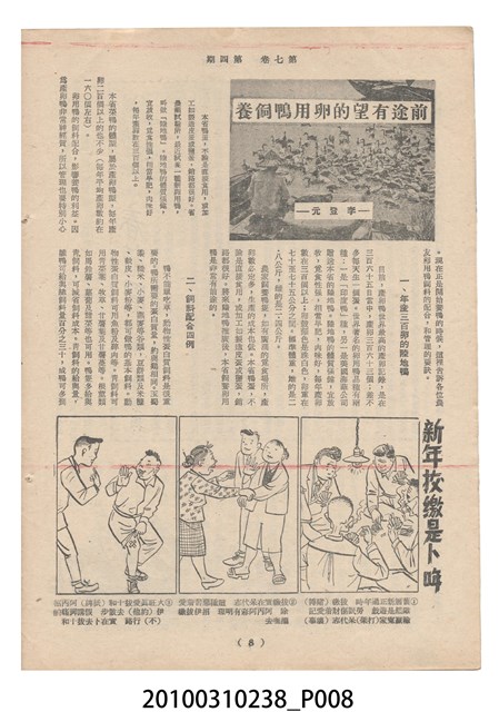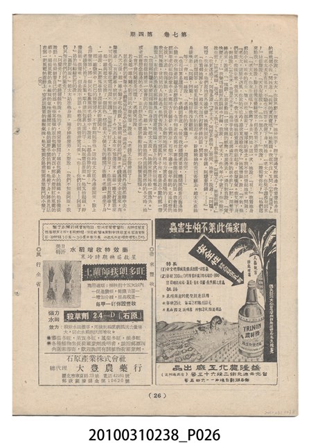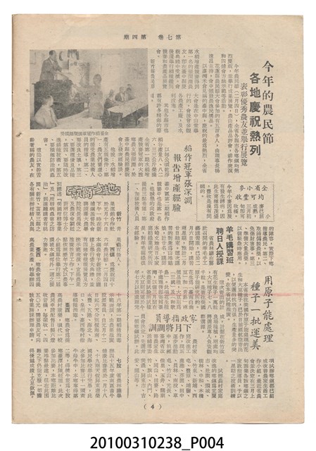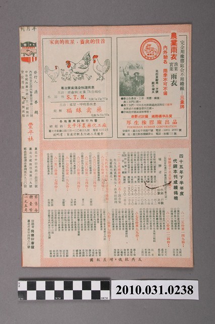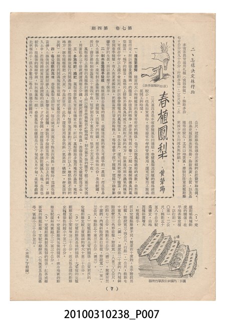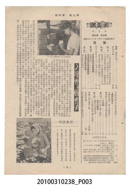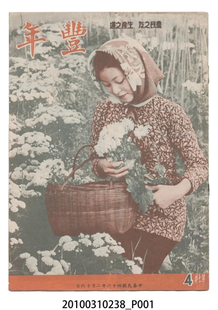 1.本物件為《豐年》雜誌第7卷第4期。封面、封底均用彩色印刷。封面以楊基炘所攝的「採菊」為底圖。左上部印期刊名,接著由右至左印「農民之友 生產之道」字樣,右下部由右而左橫印「第七卷第4期」,正下緣由右而左橫印「中華民國四十六年二月十六日」。封底左半部載定價及登記、發行、印刷等相關資訊,左上角印有豐年社的商標。內文第3頁右邊為目錄。收錄文章主要為與農畜業相關報導,此外,尚有漫畫、農村家庭、小說等專欄。
