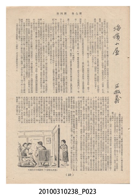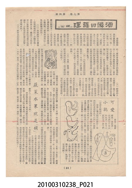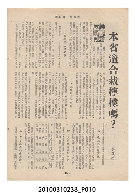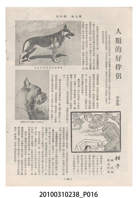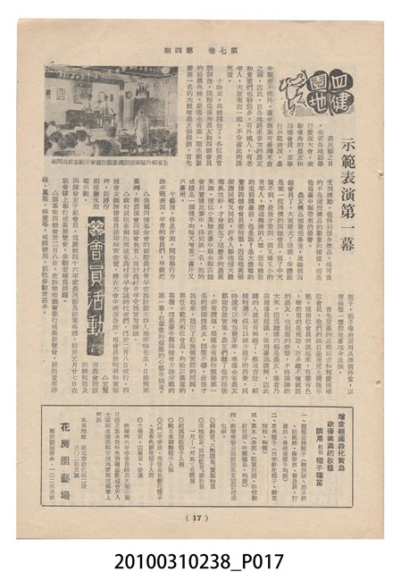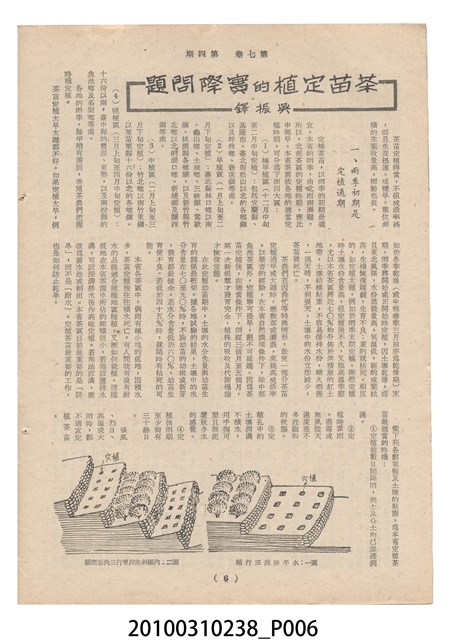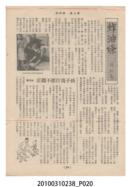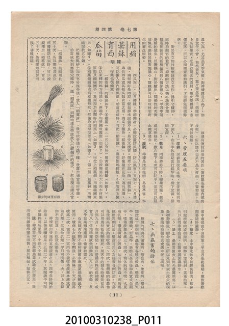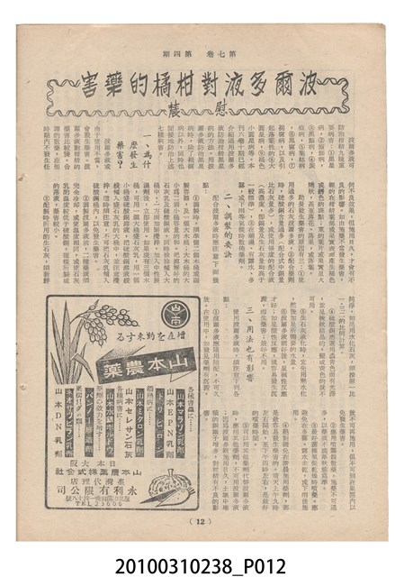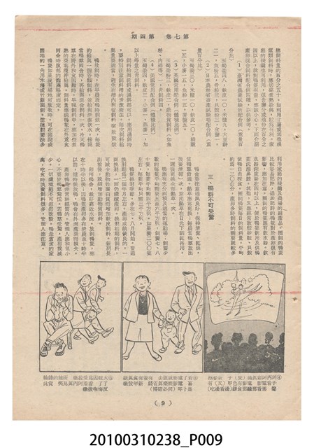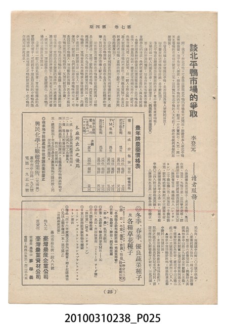 1.本物件為《豐年》雜誌第7卷第4期。封面、封底均用彩色印刷。封面以楊基炘所攝的「採菊」為底圖。左上部印期刊名,接著由右至左印「農民之友 生產之道」字樣,右下部由右而左橫印「第七卷第4期」,正下緣由右而左橫印「中華民國四十六年二月十六日」。封底左半部載定價及登記、發行、印刷等相關資訊,左上角印有豐年社的商標。內文第3頁右邊為目錄。收錄文章主要為與農畜業相關報導,此外,尚有漫畫、農村家庭、小說等專欄。