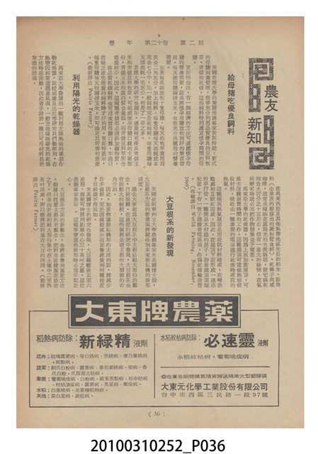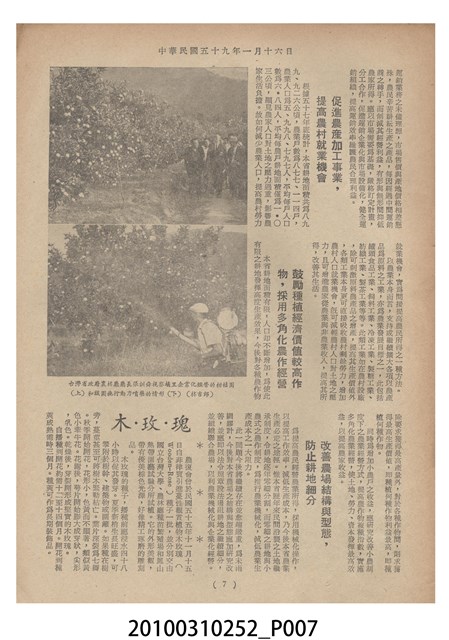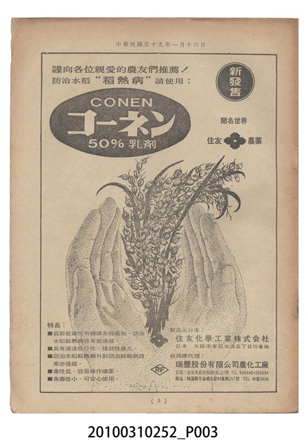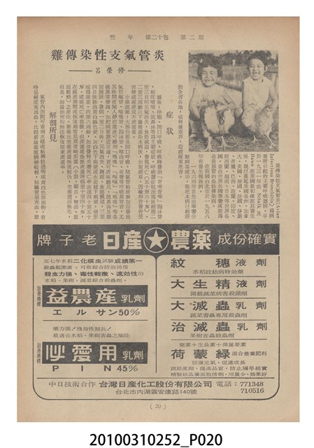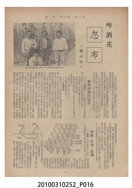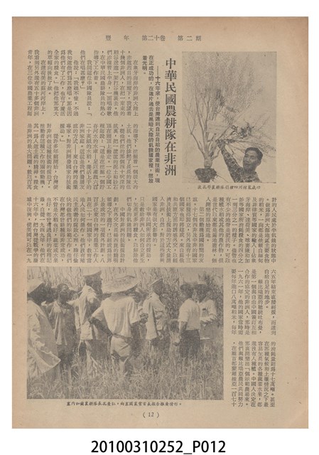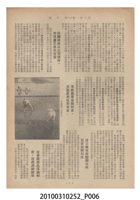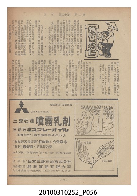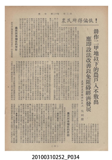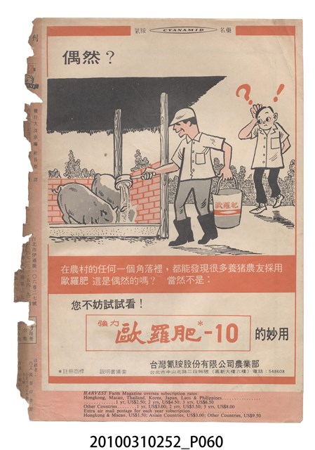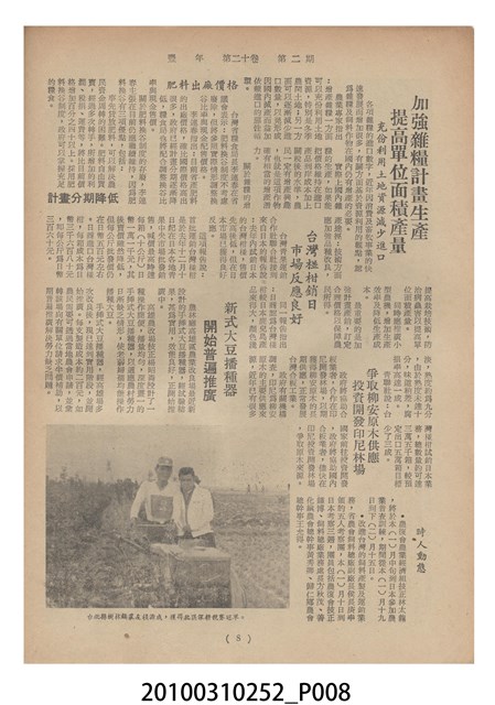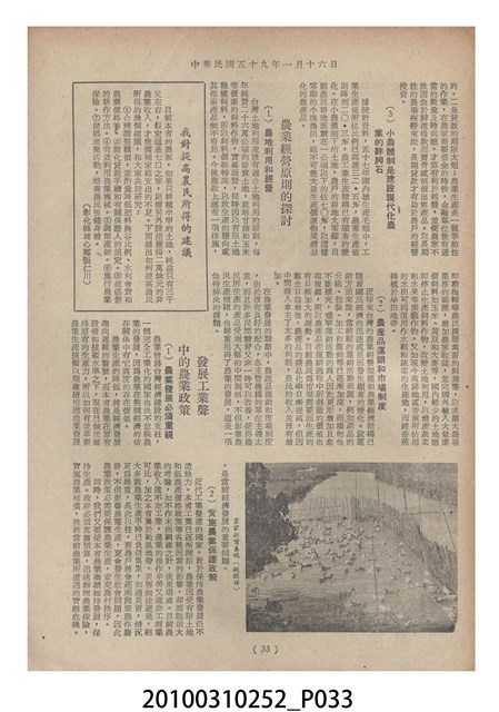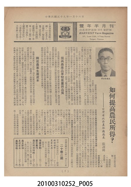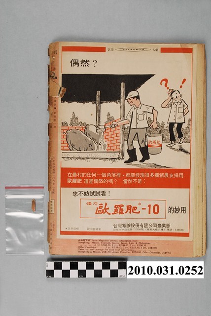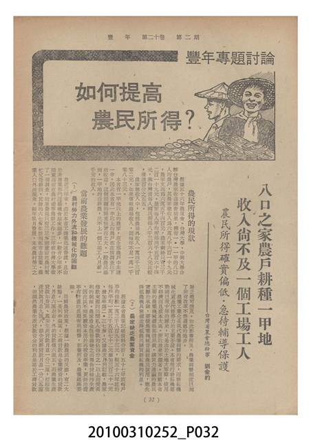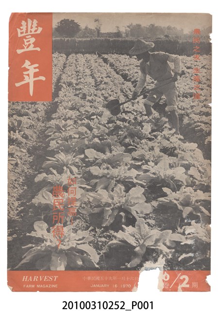 1.本物件為《豐年》雜誌第20卷第2期。封面、封底均用彩色印刷。封面以歐陽道生所攝的「菜園」為底圖。左上部直印期刊名,左下角則印英文刊名。右上角由上而下印「農民之友 生產之道」字樣,右下部由左而右橫印「第20卷第2期」,正下緣由左而右橫印「中華民國五十九年一月十六日」。封底左半部載定價及登記、發行、印刷等相關資訊,左上角印有豐年社的商標。內文第7頁左下側為目錄。收錄文章主要為與農畜業相關報導,此外,尚有農民所得特輯、農村家庭、農業信箱等專欄。