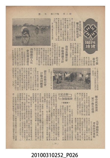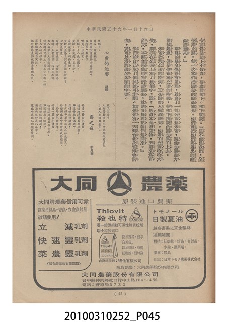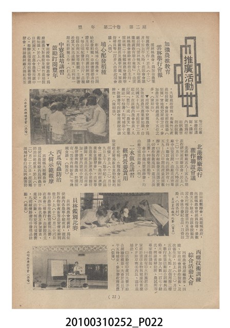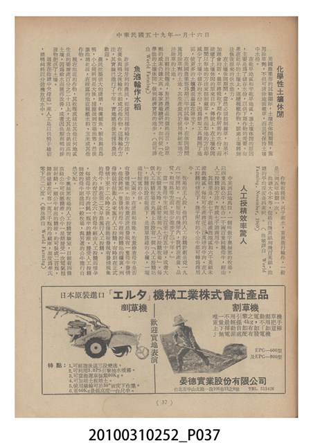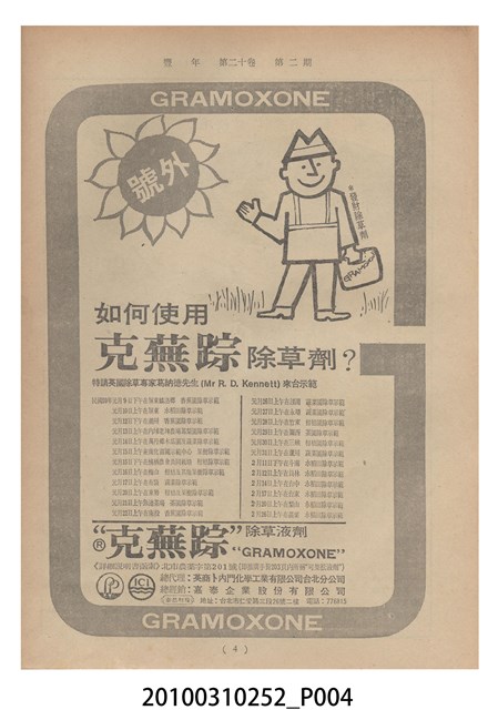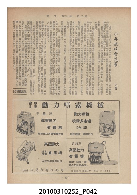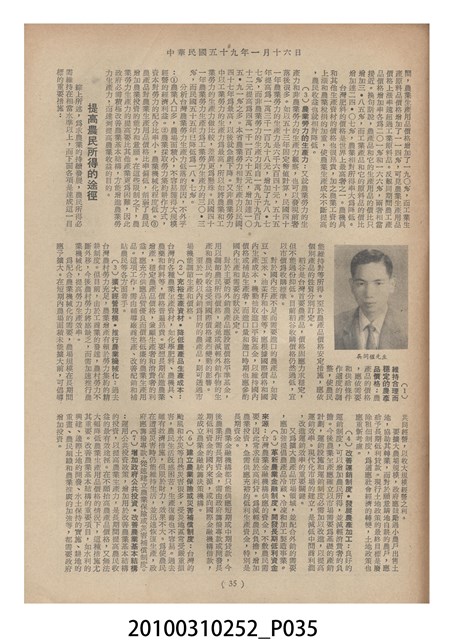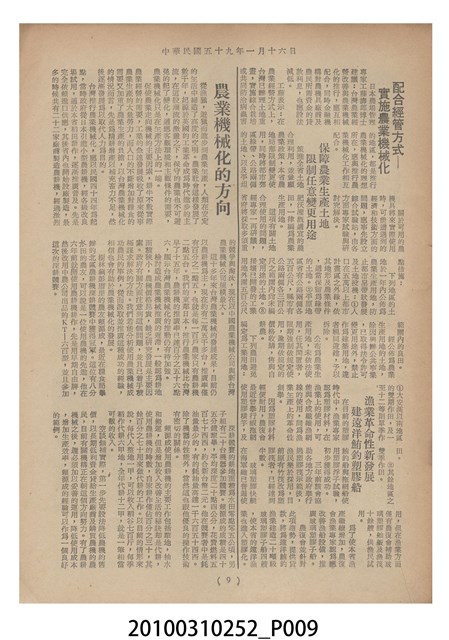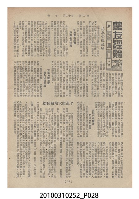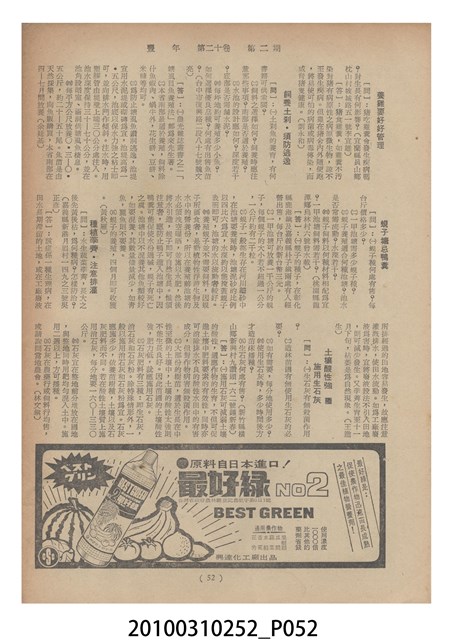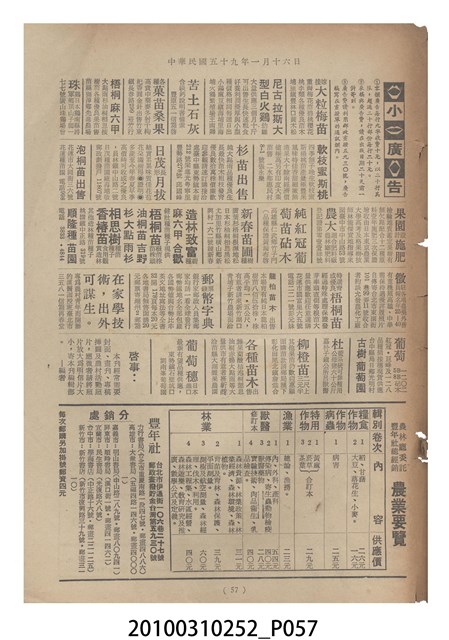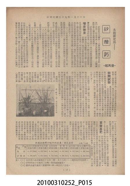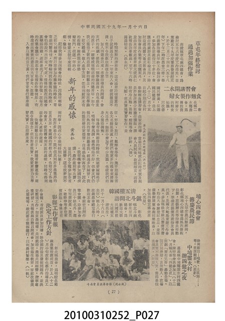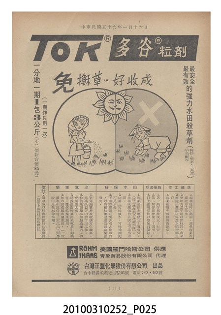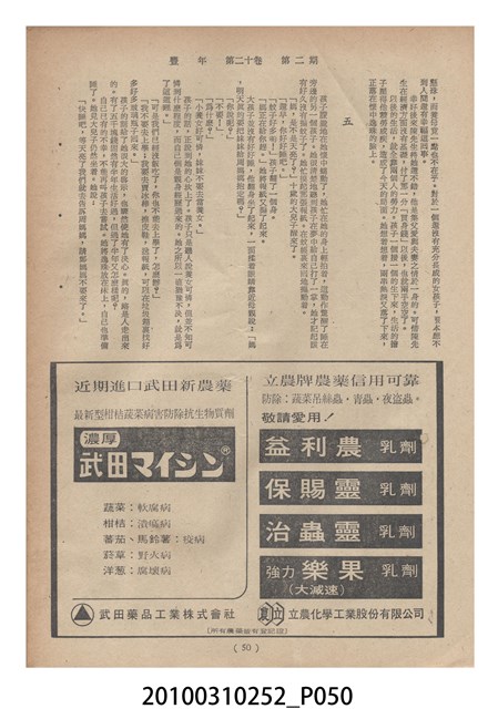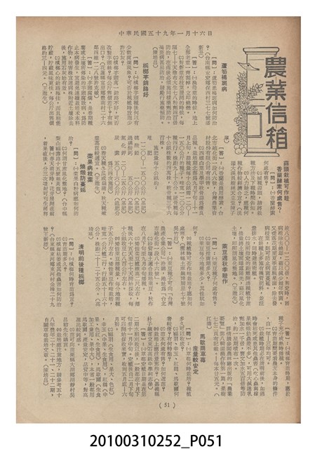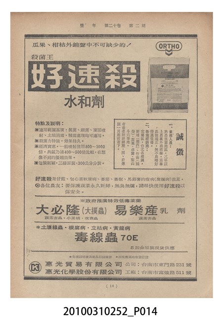 1.本物件為《豐年》雜誌第20卷第2期。封面、封底均用彩色印刷。封面以歐陽道生所攝的「菜園」為底圖。左上部直印期刊名,左下角則印英文刊名。右上角由上而下印「農民之友 生產之道」字樣,右下部由左而右橫印「第20卷第2期」,正下緣由左而右橫印「中華民國五十九年一月十六日」。封底左半部載定價及登記、發行、印刷等相關資訊,左上角印有豐年社的商標。內文第7頁左下側為目錄。收錄文章主要為與農畜業相關報導,此外,尚有農民所得特輯、農村家庭、農業信箱等專欄。