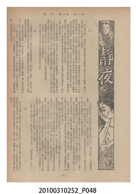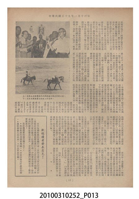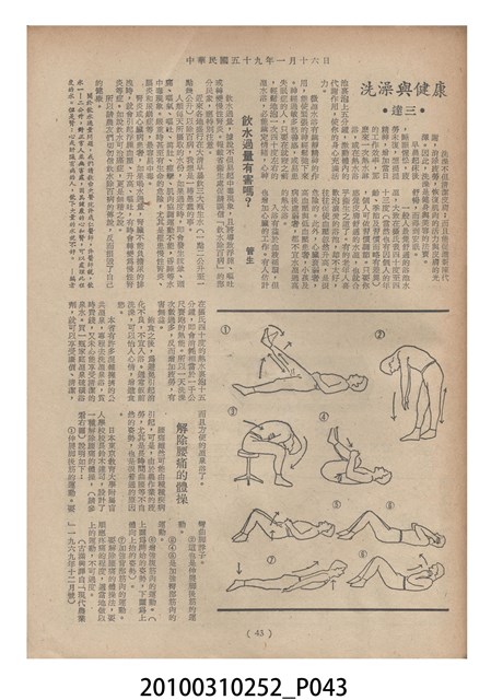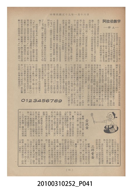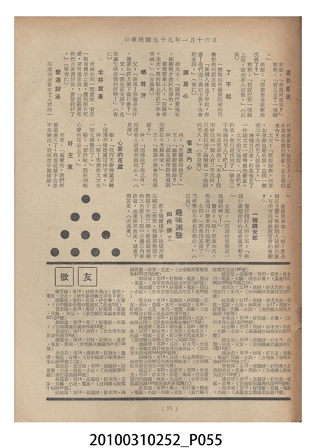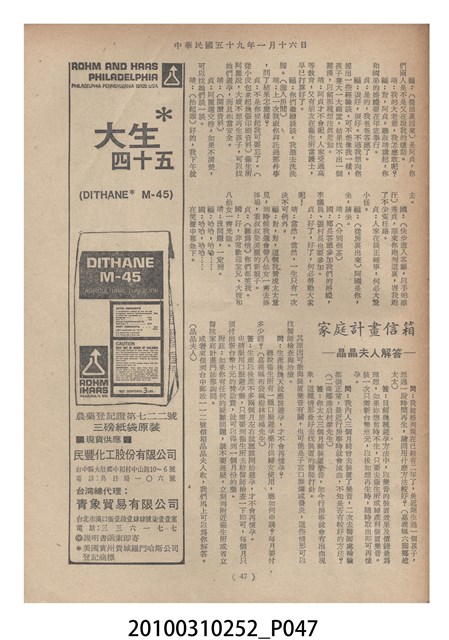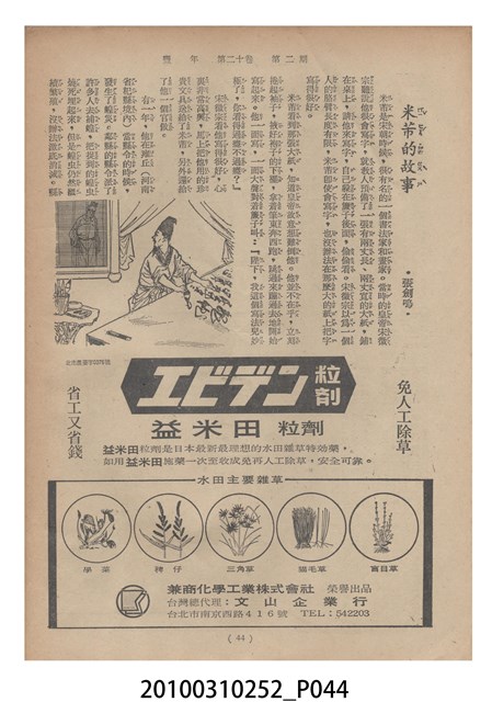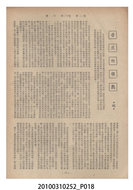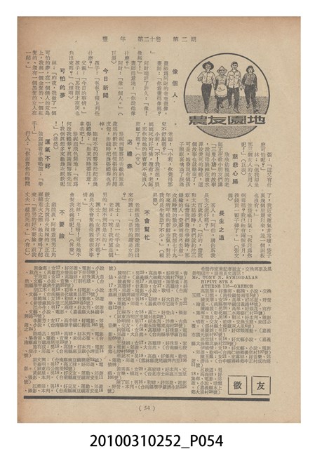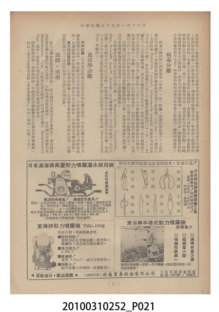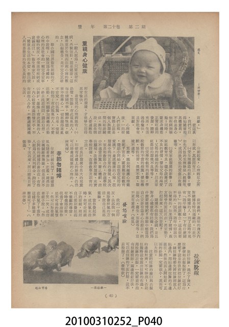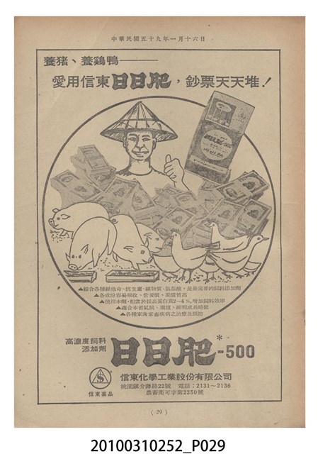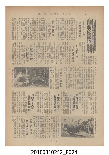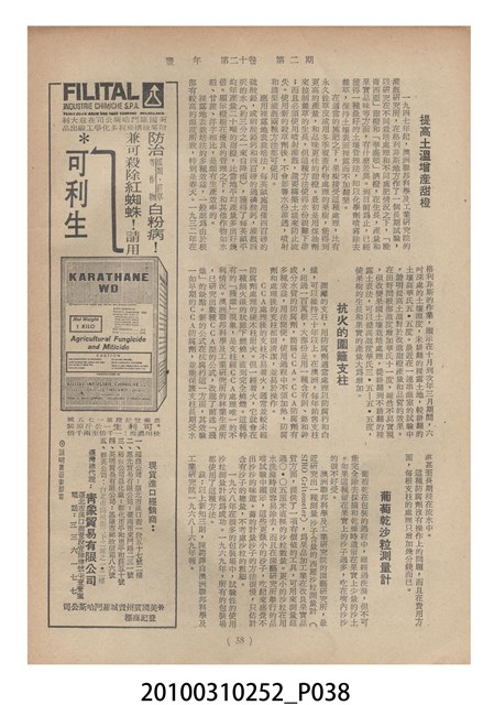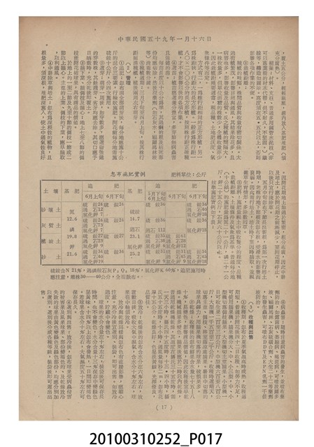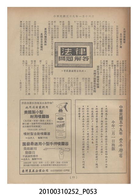 1.本物件為《豐年》雜誌第20卷第2期。封面、封底均用彩色印刷。封面以歐陽道生所攝的「菜園」為底圖。左上部直印期刊名,左下角則印英文刊名。右上角由上而下印「農民之友 生產之道」字樣,右下部由左而右橫印「第20卷第2期」,正下緣由左而右橫印「中華民國五十九年一月十六日」。封底左半部載定價及登記、發行、印刷等相關資訊,左上角印有豐年社的商標。內文第7頁左下側為目錄。收錄文章主要為與農畜業相關報導,此外,尚有農民所得特輯、農村家庭、農業信箱等專欄。