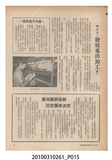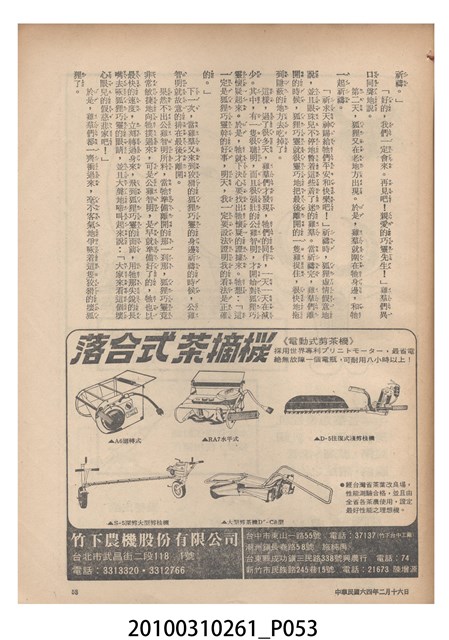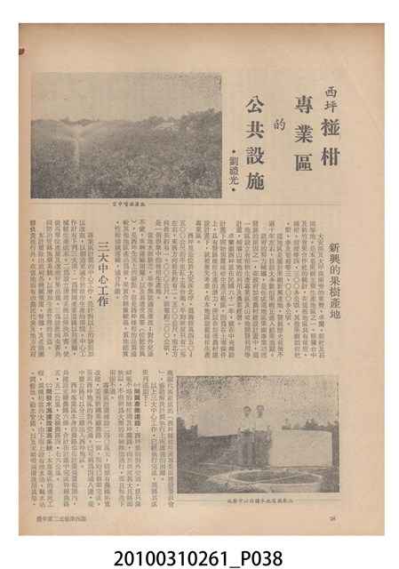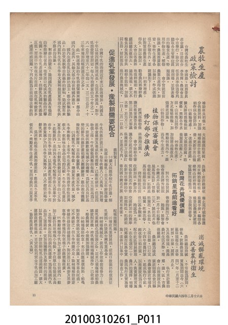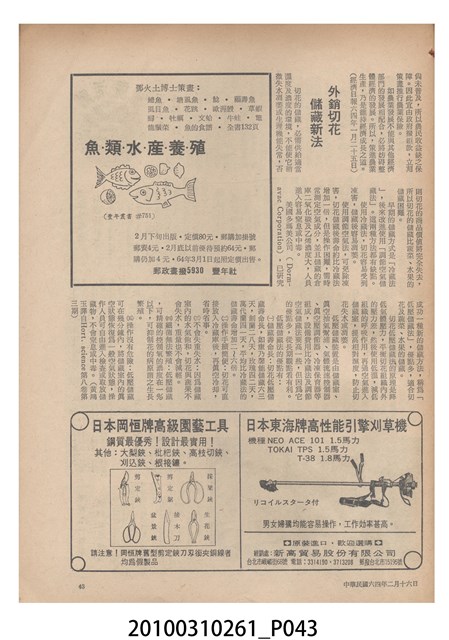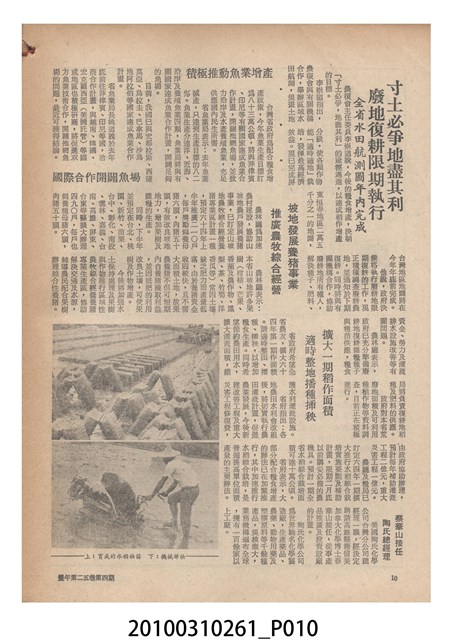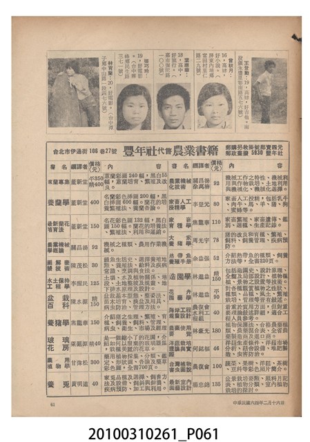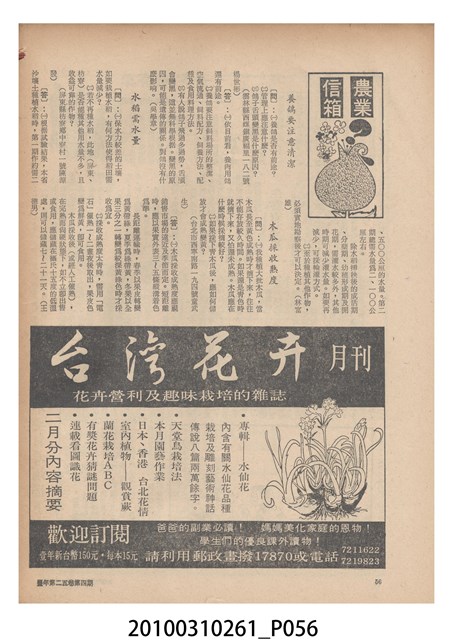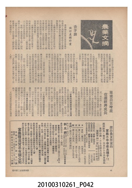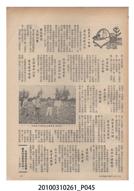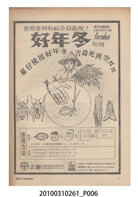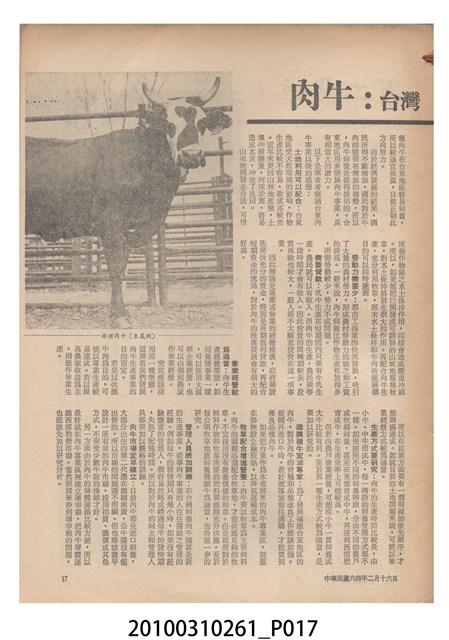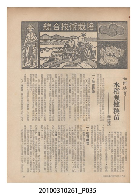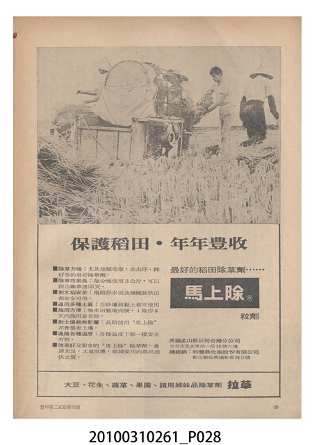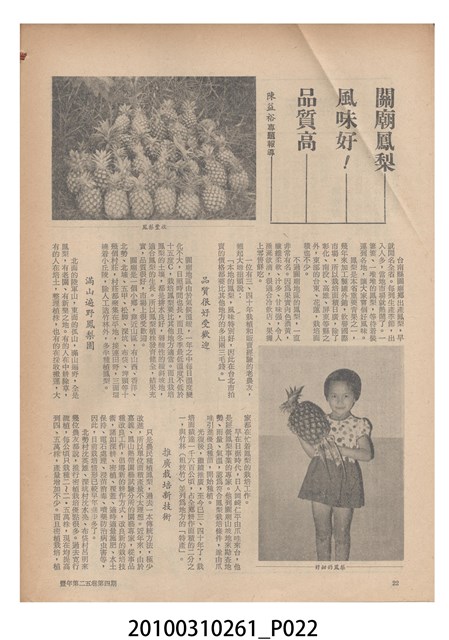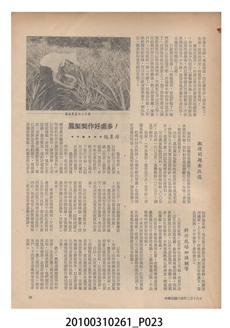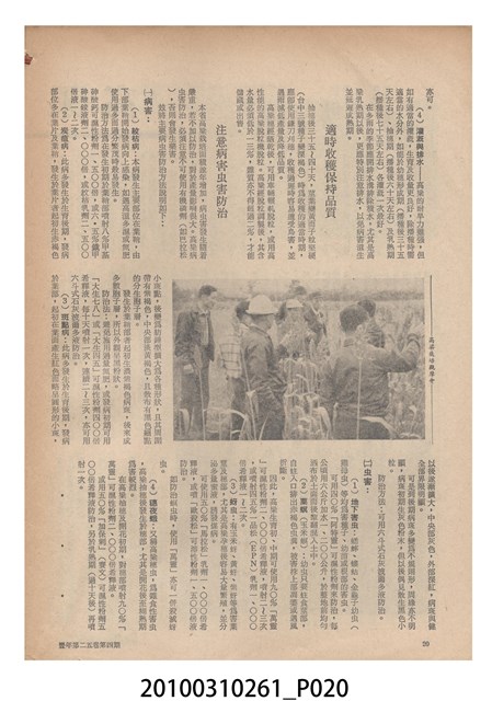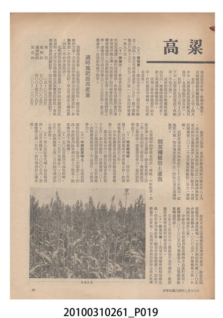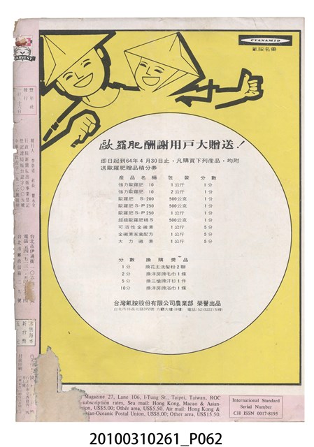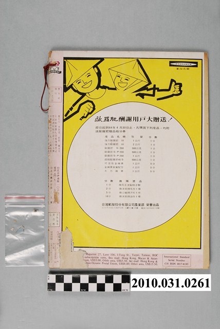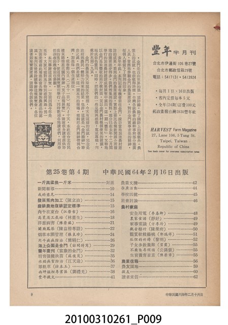 1.本物件為《豐年》雜誌第25卷第4期。封面、封底均用彩色印刷。封面以「一斤高粱換一斤米」照片為底圖。左上部直印期刊名,左下角則印英文刊名。右下角由左而右橫印「第25卷第4期」,正下緣由左而右橫印「中華民國六十四年二月十六日」。封底左半部載定價及登記、發行、印刷等相關資訊,左上角印有豐年社的商標。內文第9頁下半部為目錄。收錄文章主要為與農畜業相關報導,此外,尚有豐年畫刊、農村家庭、農業信箱等專欄。