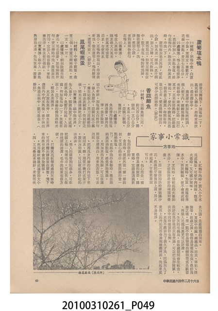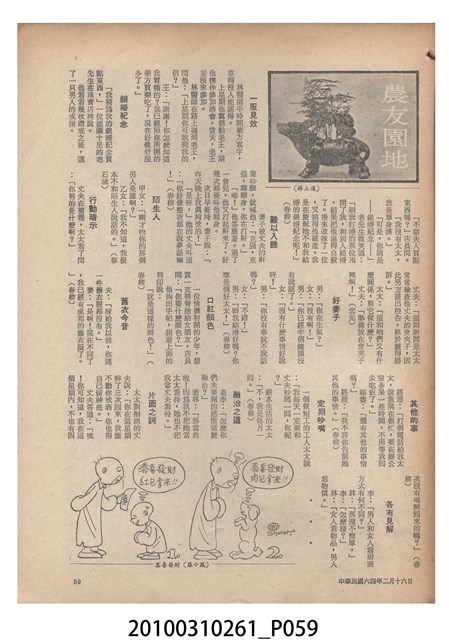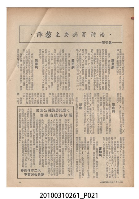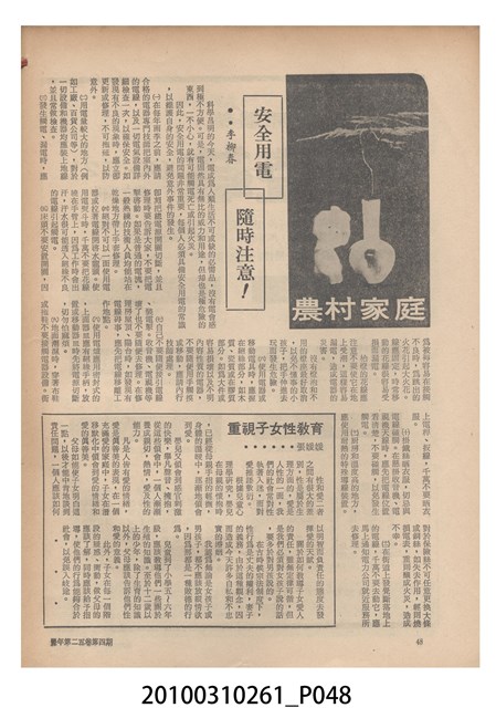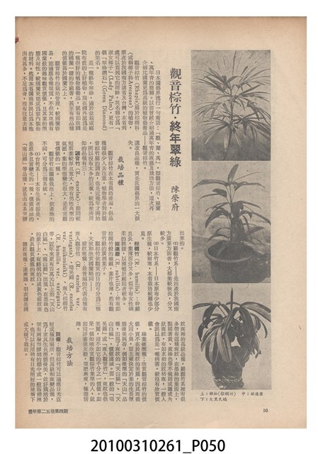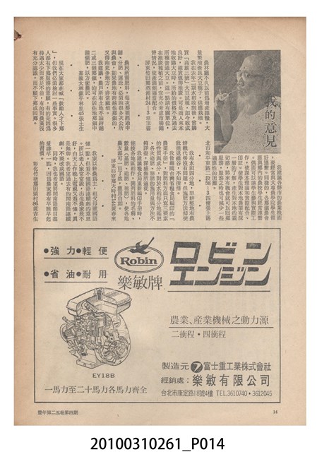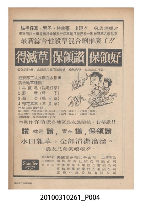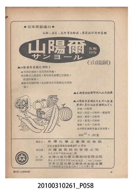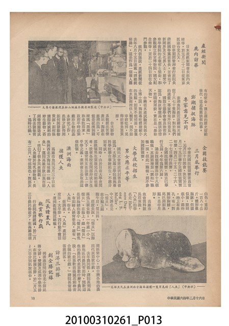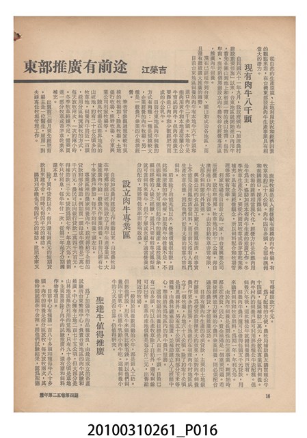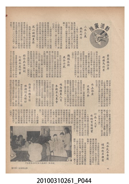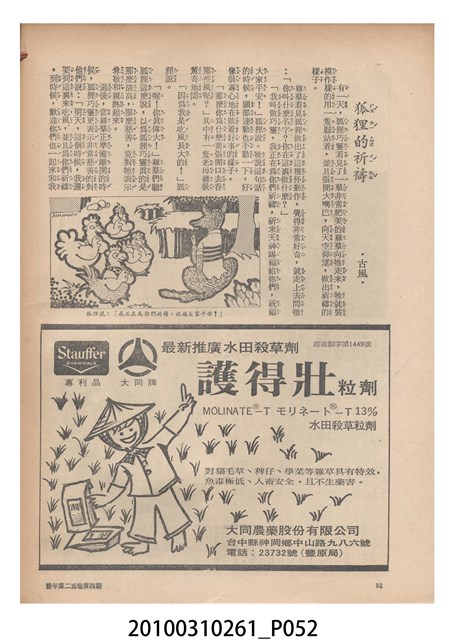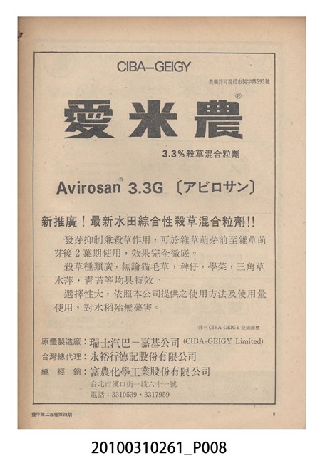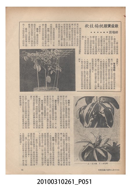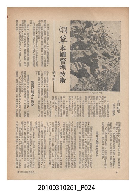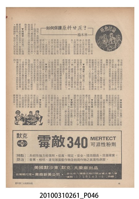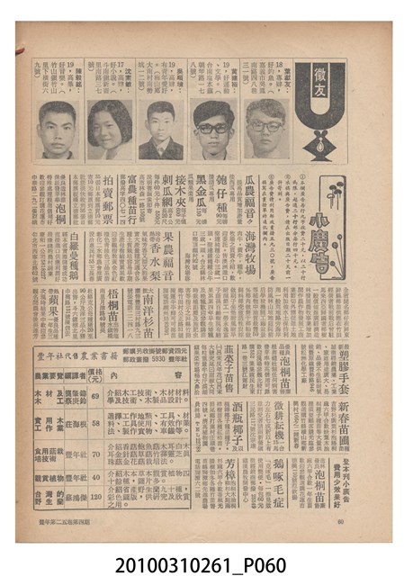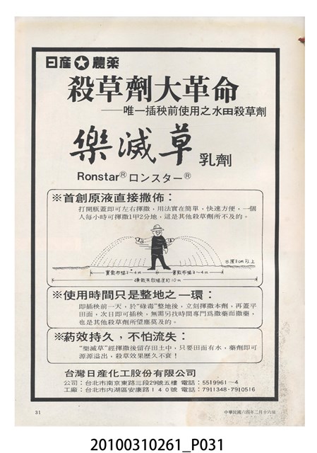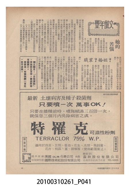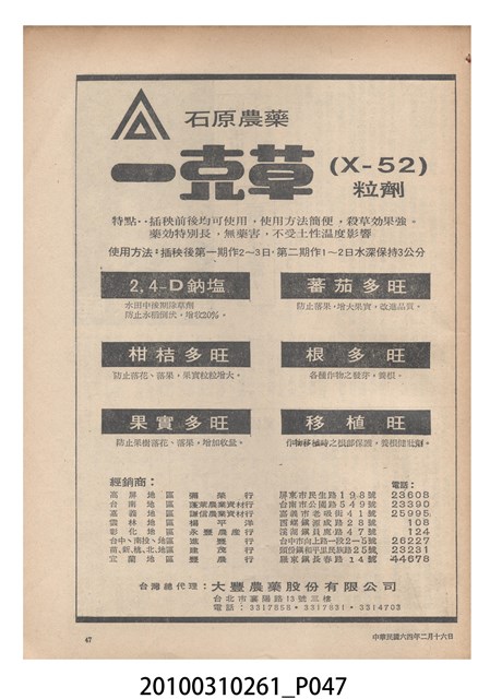 1.本物件為《豐年》雜誌第25卷第4期。封面、封底均用彩色印刷。封面以「一斤高粱換一斤米」照片為底圖。左上部直印期刊名,左下角則印英文刊名。右下角由左而右橫印「第25卷第4期」,正下緣由左而右橫印「中華民國六十四年二月十六日」。封底左半部載定價及登記、發行、印刷等相關資訊,左上角印有豐年社的商標。內文第9頁下半部為目錄。收錄文章主要為與農畜業相關報導,此外,尚有豐年畫刊、農村家庭、農業信箱等專欄。