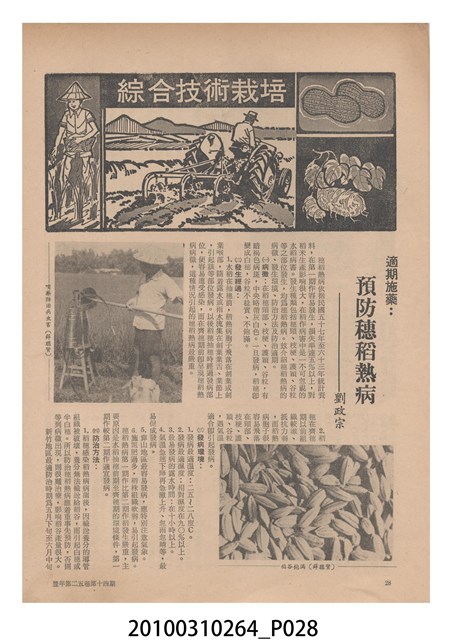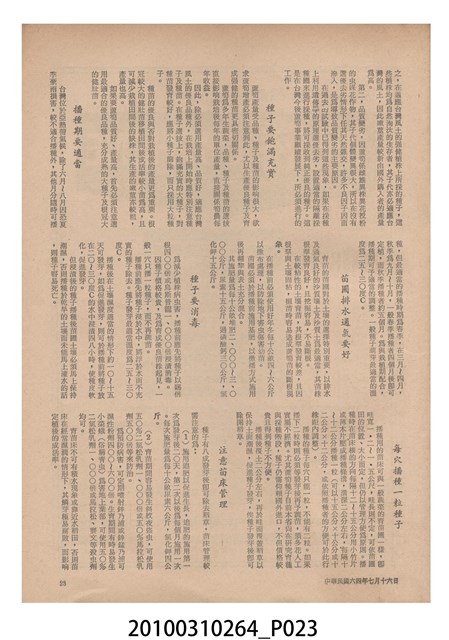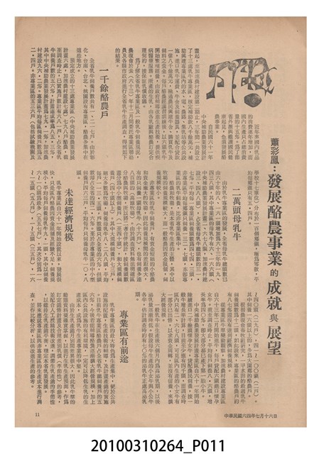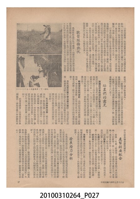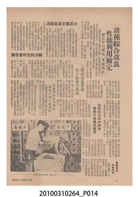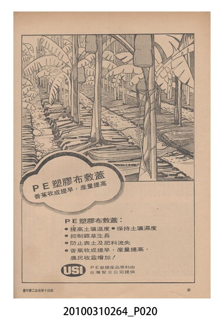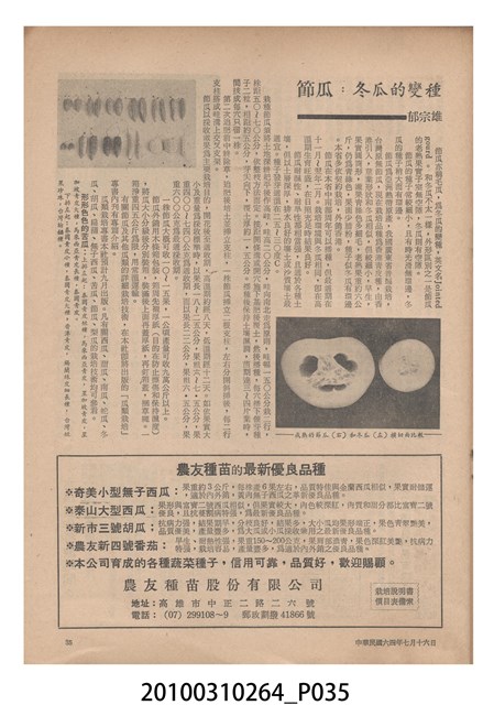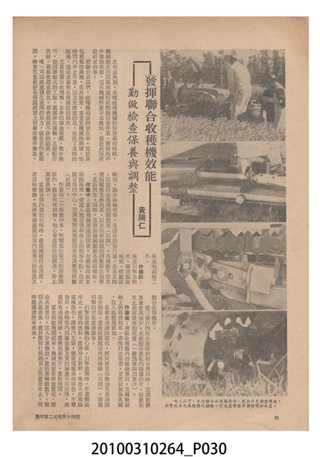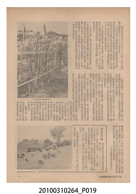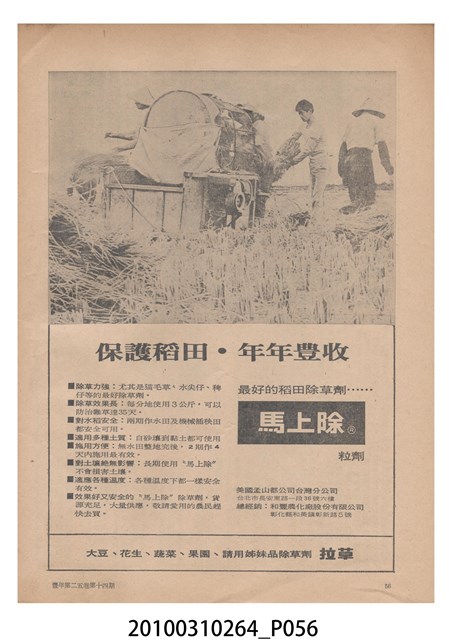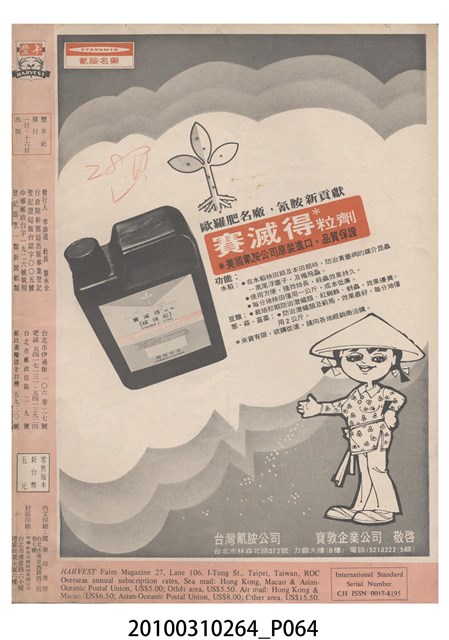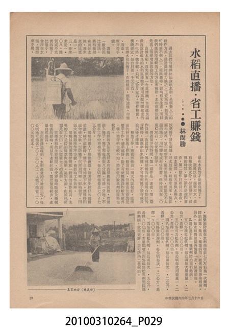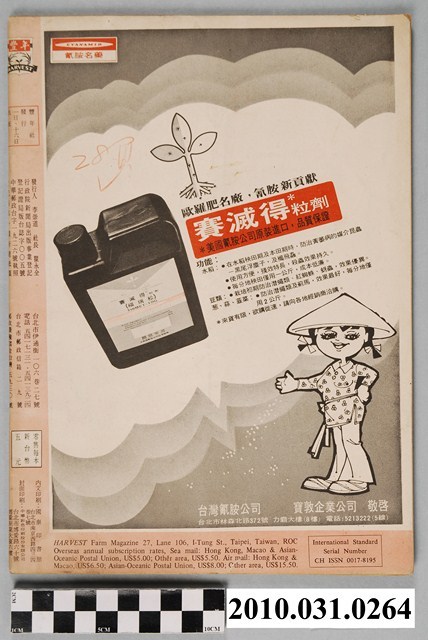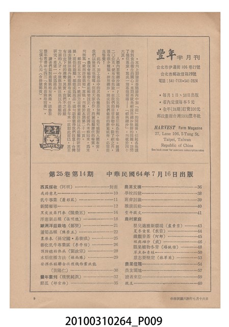 1.本物件為《豐年》雜誌第25卷第14期,是創刊25週年紀念版。封面、封底均用彩色印刷。封面以阿明所攝的「西瓜採收」為底圖。左上部直印期刊名,左下角則印英文刊名。右上角自上而下印「創刊二十五週年紀念」字樣,右下角由左而右橫印「第25卷第14期」,正下緣由左而右橫印「中華民國六十四年七月十六日」。封底左半部載定價及登記、發行、印刷等相關資訊,左上角印有豐年社的商標。內文第9頁下半部為目錄。收錄文章主要為與農畜業相關報導,此外,尚有豐年畫刊、農業文摘、農村家庭、農業信箱等專欄。