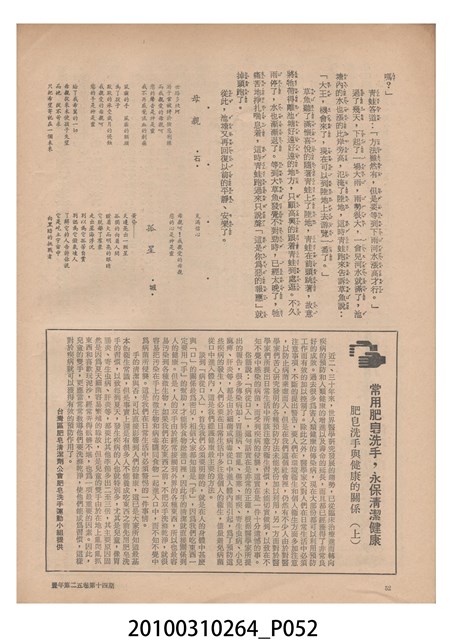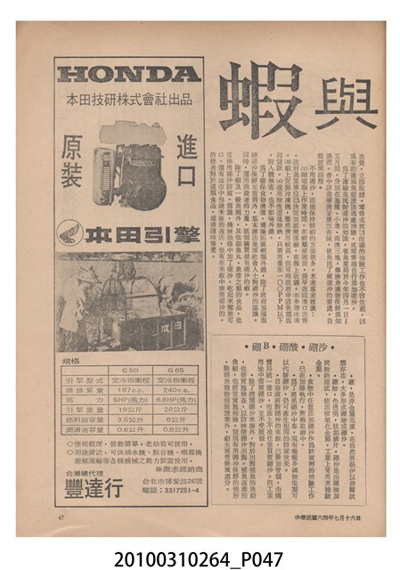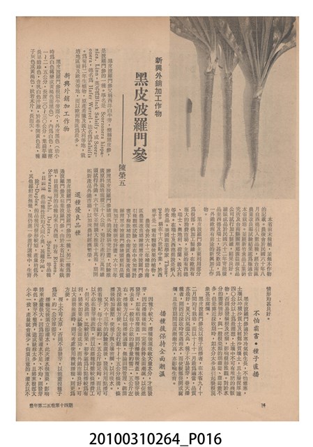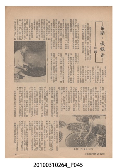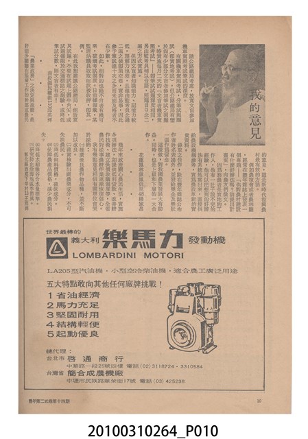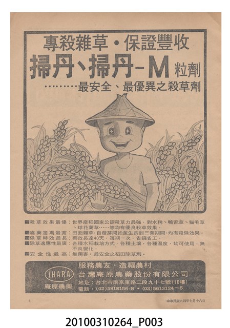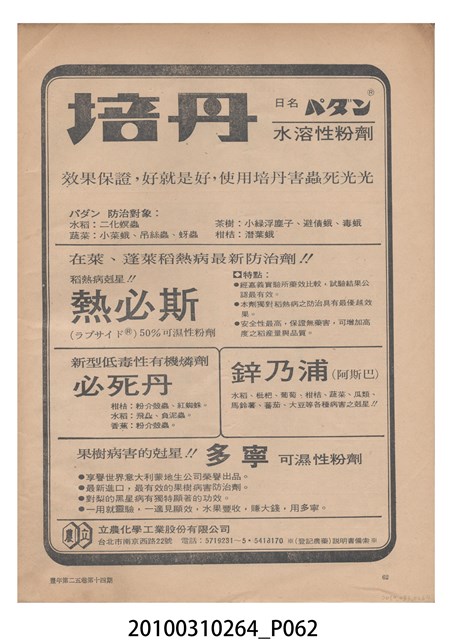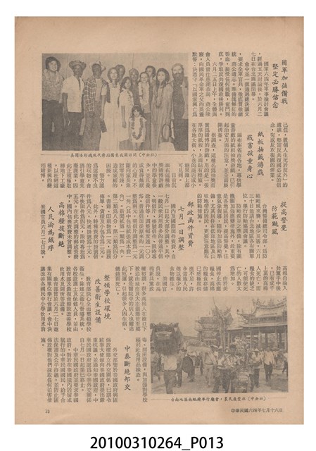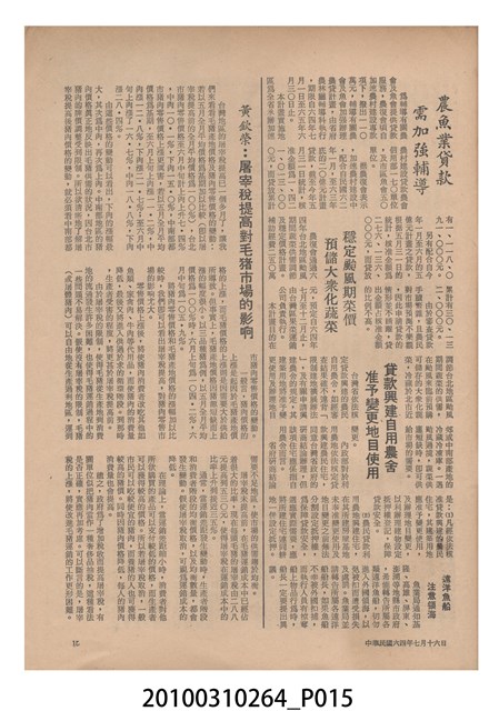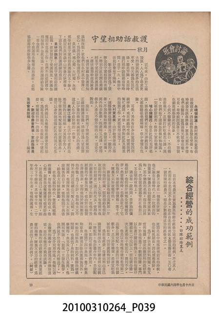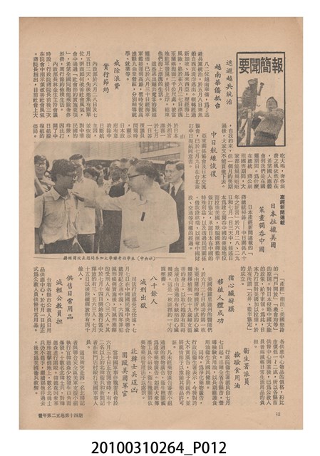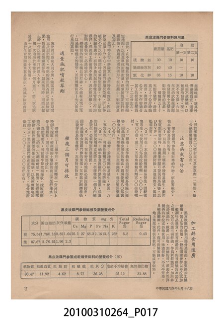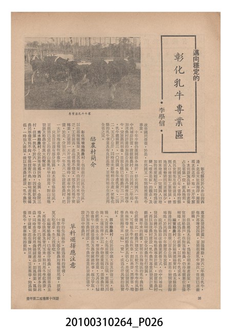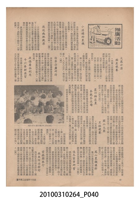 1.本物件為《豐年》雜誌第25卷第14期,是創刊25週年紀念版。封面、封底均用彩色印刷。封面以阿明所攝的「西瓜採收」為底圖。左上部直印期刊名,左下角則印英文刊名。右上角自上而下印「創刊二十五週年紀念」字樣,右下角由左而右橫印「第25卷第14期」,正下緣由左而右橫印「中華民國六十四年七月十六日」。封底左半部載定價及登記、發行、印刷等相關資訊,左上角印有豐年社的商標。內文第9頁下半部為目錄。收錄文章主要為與農畜業相關報導,此外,尚有豐年畫刊、農業文摘、農村家庭、農業信箱等專欄。
