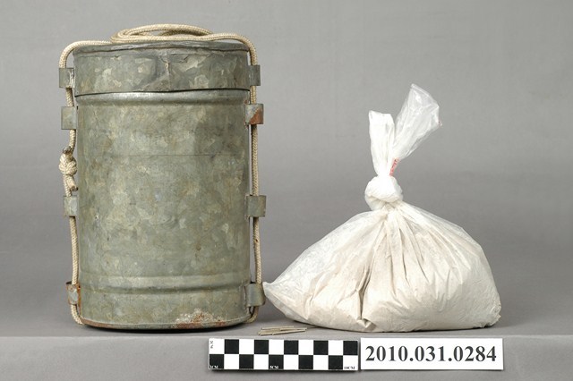 1.本件鍍鋅板製電土保存筒整體以鍍鋅鐵板製作,器表帶有銀灰色斑點,接縫焊合處有褐色鏽痕。其部件可分為筒蓋、筒身與電石3部件,保存筒為圓形長直筒狀,蓋身口緣略大於筒身,作套合式開闔,筒身與筒蓋兩側身皆帶有管狀立耳,並以繩索串聯,既可用做提繩與吊掛使用,也可防止筒蓋遺失。電土則以透明塑膠袋裝盛。2.臺灣早期在電燈尚未普遍的時代,係以油燈、蠟燭、電石等做為夜間照明工具。電石,又稱電土,為碳化鈣(CaC2),因水接觸到電土會釋放乙炔氣體,可於噴火嘴點燃可做照明之用,透過上座電石燈與油燈、蠟燭相比照明度較亮,且具有防風的特性,因此多使用於夜間戶外,如農民巡田水、捕捉鱔魚青蛙、皮影戲、出海捕魚等用途,早期於一般雜貨店即可購買。