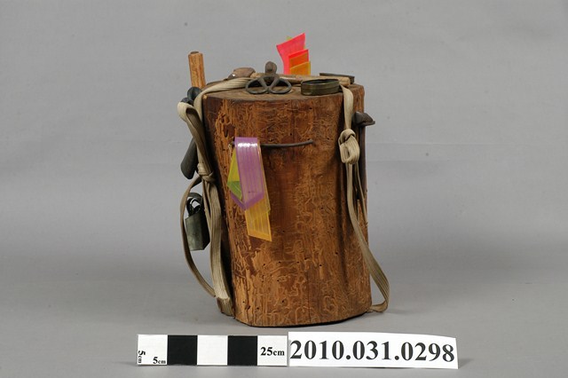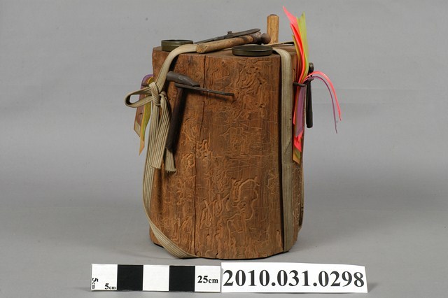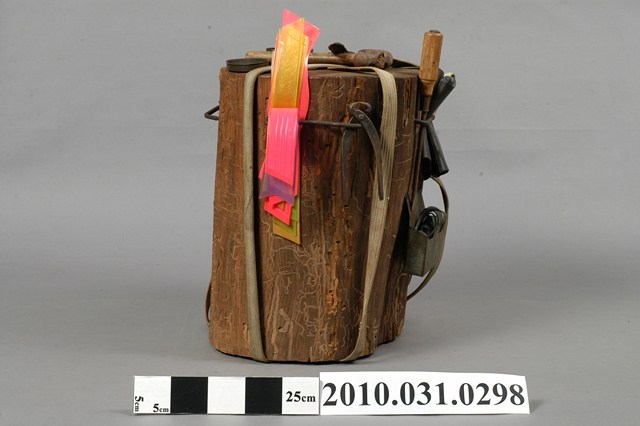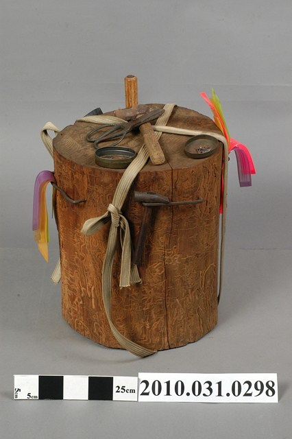 1.本物件為一組釘木屐用具,包含一個木製工作臺、兩把鐵鎚、一把剪刀、一把平起子、一把虎頭鉗、九片左側屐耳(鞋帶)塑膠片、四片右側屐耳(鞋帶)塑膠片、兩個長形橡膠皮套、八個小橡膠圈、四十四根鐵釘。
