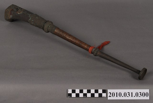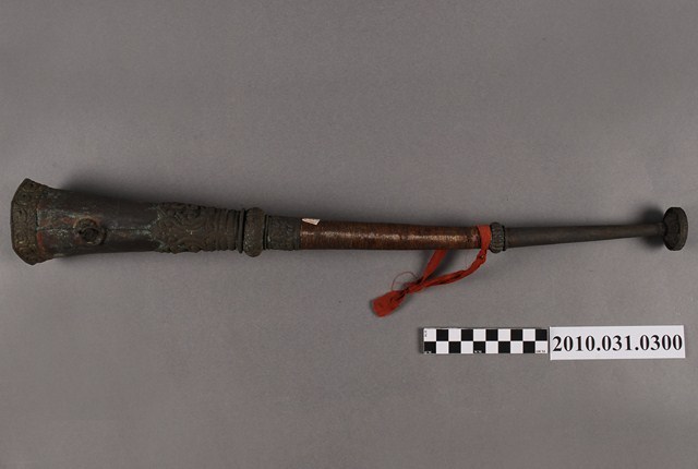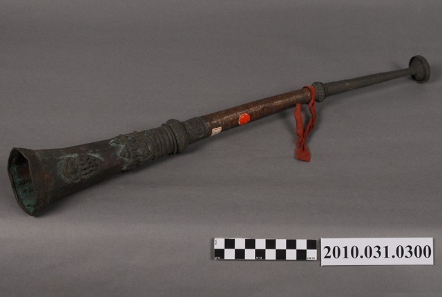 法角又稱龍角、號角,多在儀式中用以召喚兵將,主要材質有牛角、象牙或是錫、銅等,其外型一般作圓弧狀。本件法角為銅鑄,上下未作彎曲形狀,在材質與造形上較為少見。