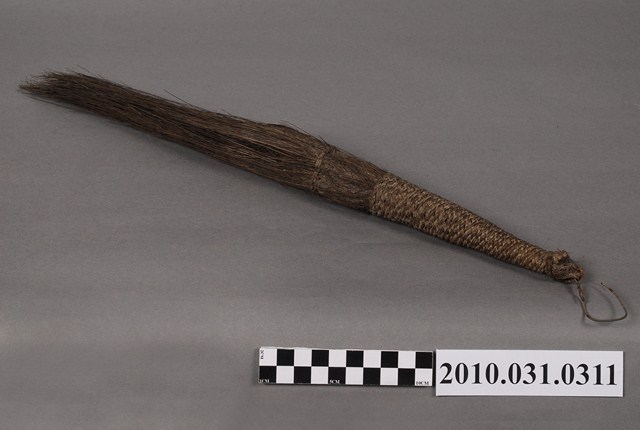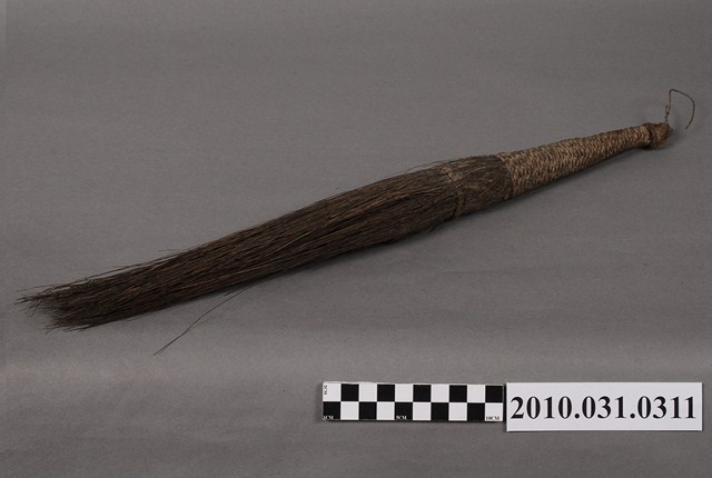 本件拂塵通身以馬尾編製,是較為少見的形式。握柄與拂毛經長期使用而有污漬現象,握柄處以麻繩圈縛而成,頂端繫有棉繩以利提取或懸掛。拂毛部位以棕色馬尾束成,並有局部顏色變深現象。