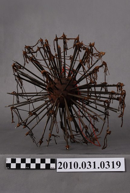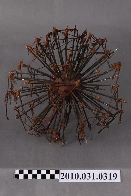 本件刺球在小木球上裝置長金屬針,並在各針的尖端圈繞上紅色棉繩,彼此相連而成球狀,球體、金屬針佈滿汙漬,且多數棉繩已呈斷毀,球體繫上一條較新之紅棉繩,可供提取。