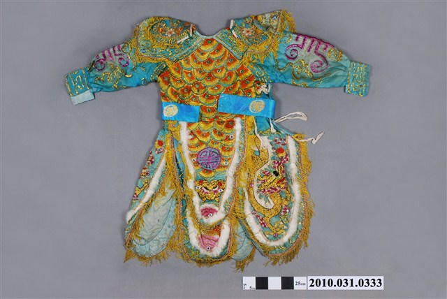 1.本件為八家將藍色法服1套,藍色的綢布繡上各種吉祥紋路的服飾,包含一件式長袖甲衣和甲裙(龍虎裙),以及配件雲肩(披肩)和腰帶。2.八家將的巡捕理論,有學者認為是清代縣署巡捕組織的神格化。扮將者身穿法服,頭戴盔帽,足踏草鞋,手執法器或刑具,不僅能震懾陰司,也能警訓世間。