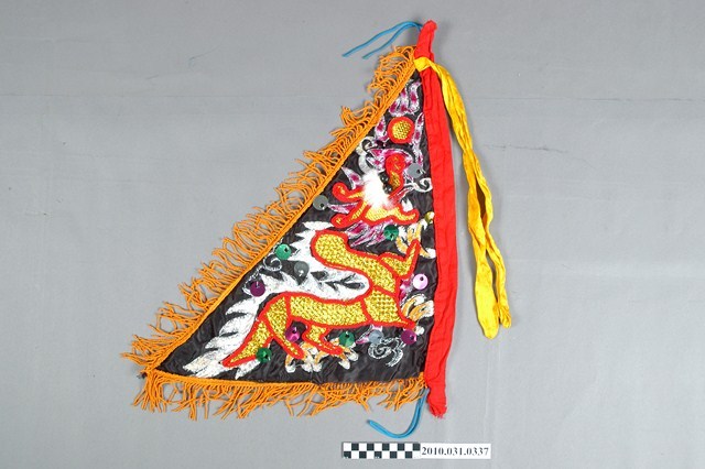 1.本件為八家將黑色令旗,形制為三角形,黑色綢布繡上升龍紋,斜邊和鄰邊裝飾黃色流蘇,對邊有黃色緞帶和藍色繩子可供綁繫。令旗一般為差爺所持拿。2.八家將的巡捕理論,有學者認為是清代縣署巡捕組織的神格化。扮將者身穿法服,頭戴盔帽,足踏草鞋,手執法器或刑具,不僅能震懾陰司,也能警訓世間。