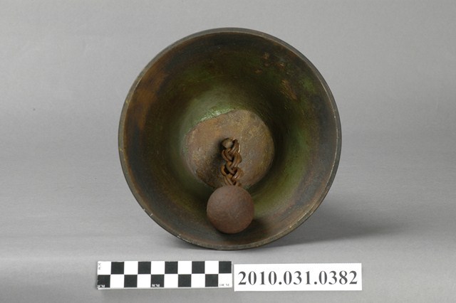 本文物為手搖鐘。手把處為木製,刻有三圈紋路。鐘體為金屬製品,推斷為銅製,外觀呈古銅色,表面無特殊花紋,但局部已氧化,成黑色。鐘體內部鍊有一顆金屬球體,透過搖晃時碰撞鐘體,發出聲響,達到通知或警示的用途。