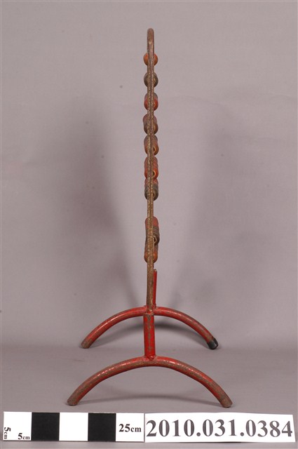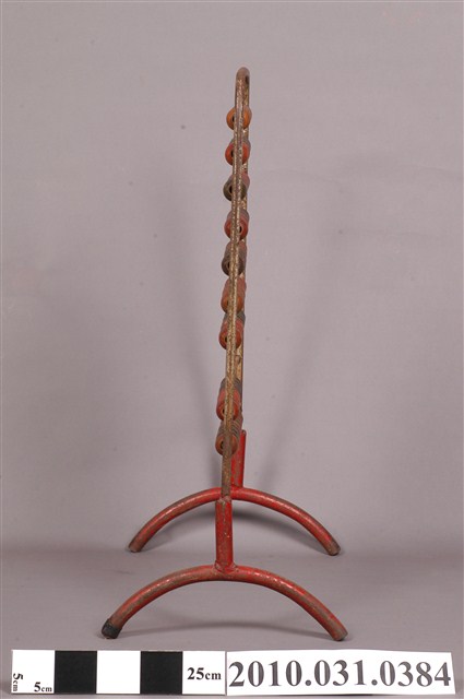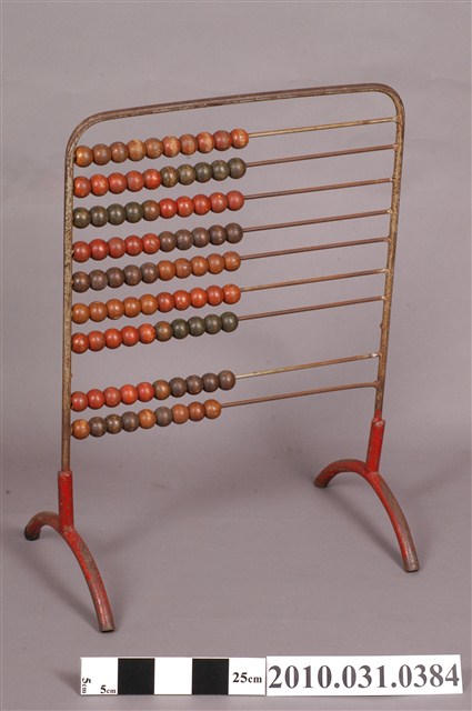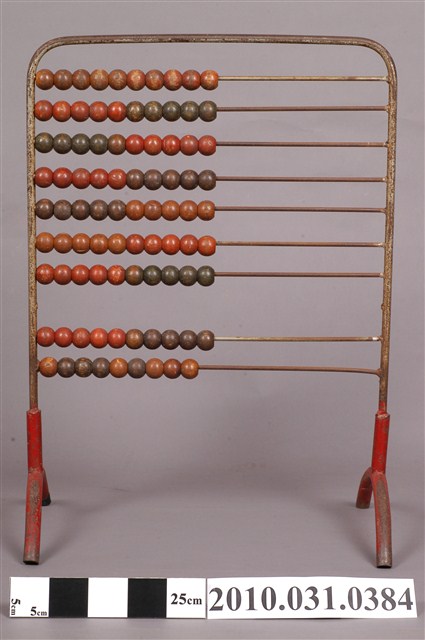 本文物為教算數用算珠臺。珠算臺為金屬架,以4根支腳站立。珠算臺上可見9串算珠,應是有1串斷裂散佚,每串有10顆算珠,但最下面一串僅有9顆算珠。算珠為木製品,是圓球形,外觀已褪色 ,原來應是有藍、紅和橘等色。