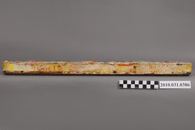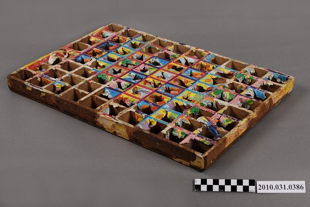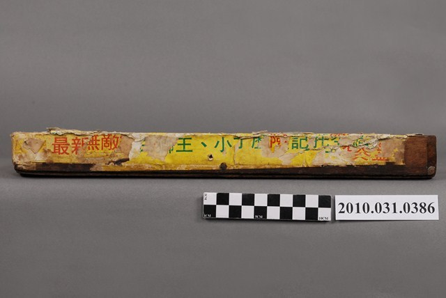 1.本物件為80洞抽抽樂,底盒為木質,該盒盒洞為8*10,全數皆開封,表面僅剩殘破的封紙,盒身側邊隱約可見「最新無敵」、「小丁歷險記」等字樣,應為盒內獎品預告。