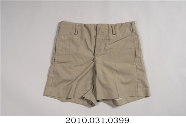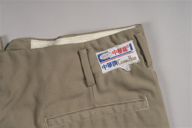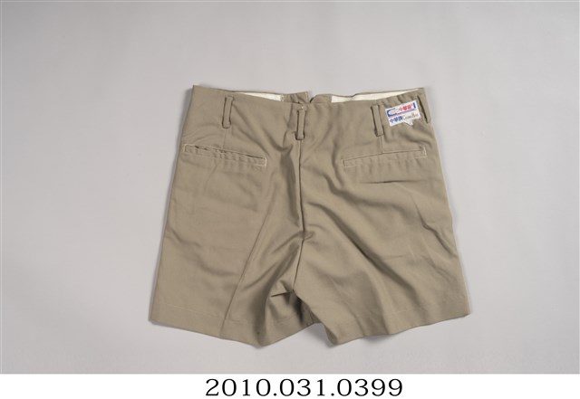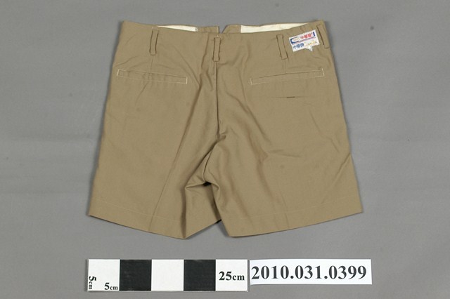 民國34年(1945年)臺灣光復後,一般學生制服大體上延續日本時代的穿著,夏季男生制服大致為白色國民領上衣配卡其色短褲,冬天則為全身長卡其服。民國57年 (1968年)實施九年國民教育,把國民學校改為國民小學,一般小學生的穿著與從前類似,且皆可在商店購買得到,一直到民國76年(1987年)「戒嚴政令」解除,取消統一制服,學生制服才呈現出活潑、多元的新氣象。此為小學生冬季的卡其色長褲,是一種棉和化學纖維混紡而成的織品,具有耐磨、快乾、不易皺的特性。此件短褲前襠鈕釦做開口,褲子左右兩側各一個脇口袋,左前片有一個小的零錢袋,後身左右兩邊均有一個單緄邊口袋,腰頭有褲袢,正面四個,背面三個,腰頭右後方車有制服廠牌商標。