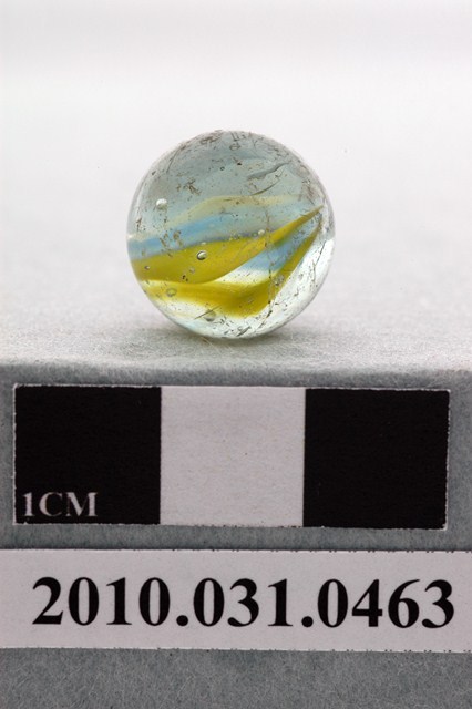 1.本物件為花彩玻璃彈珠,球體,材質為玻璃,表面呈透明,有些許污斑及裂痕,可透視內部,並於內部鑲嵌黃、白、淡藍三色玻璃材質,呈波浪狀,形如花瓣、楊桃,內部佈有部分氣泡。