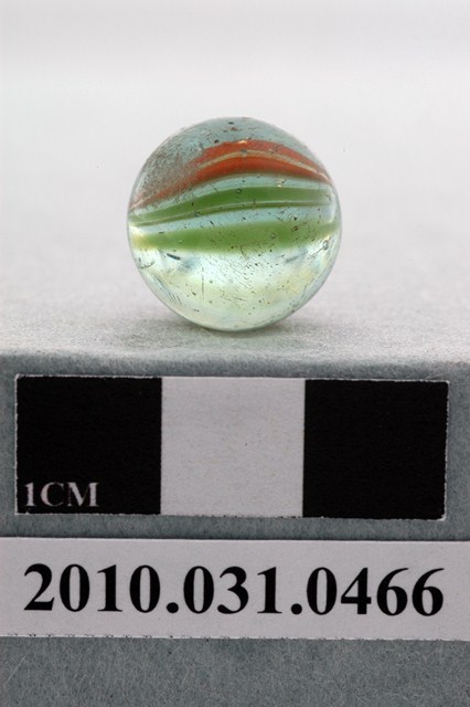 1.本物件為花彩玻璃彈珠,球體,材質為玻璃,表面呈透明,有些許污斑,可透視內部,並於內部鑲嵌綠、橘、白三色玻璃材質,呈波浪狀,形如花瓣、楊桃,內部佈有部分氣泡。