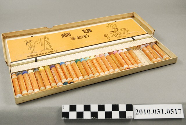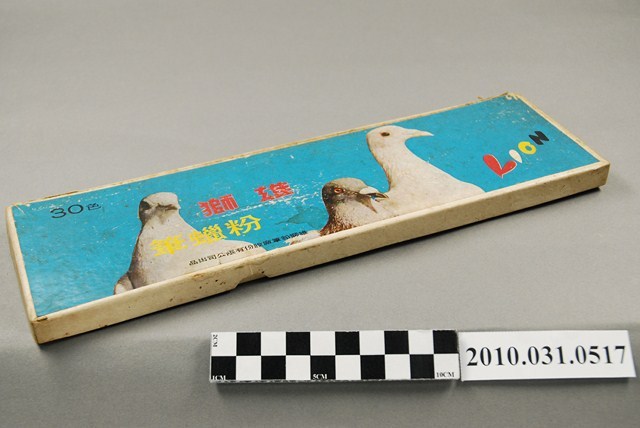1. 本文物為雄獅鉛筆廠股份有限公司出品雄獅粉蠟筆30色。外包裝為紙盒,盒蓋印有3隻鴿子,2隻白鴿,1隻灰鴿圖片,另有30色、雄獅粉蠟筆、雄獅鉛筆廠股份有限公司出品、Lion字樣。盒蓋打開可見27隻粉蠟筆,有白色、粉紅色、咖啡色、紫色、綠色、黃色、藍色等,粉蠟筆筆身包有橘色紙捲,盒蓋內側有畫家畫圖和孩童遊玩之圖片,以及雄獅粉蠟筆和雄獅鉛筆廠股份有限公司字樣。2. 雄獅鉛筆成立於西元1956年,故此物件為西元1945年之後產品。