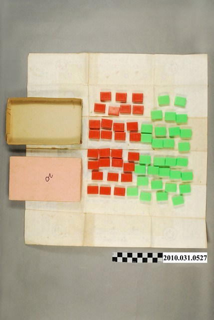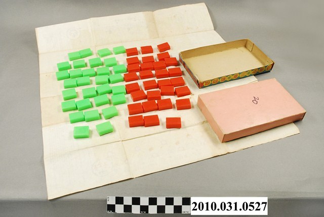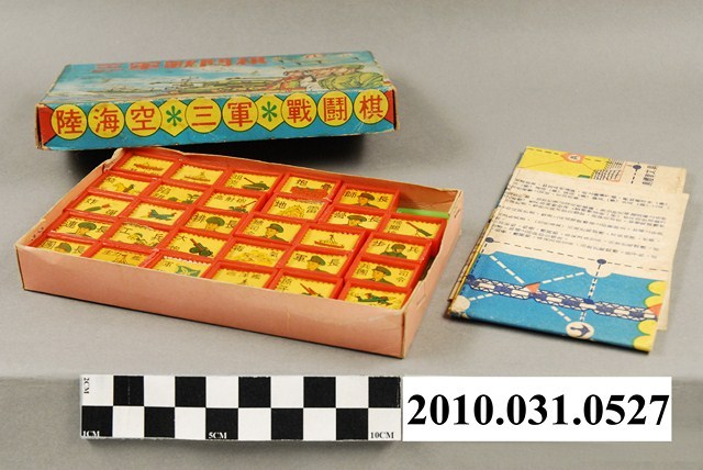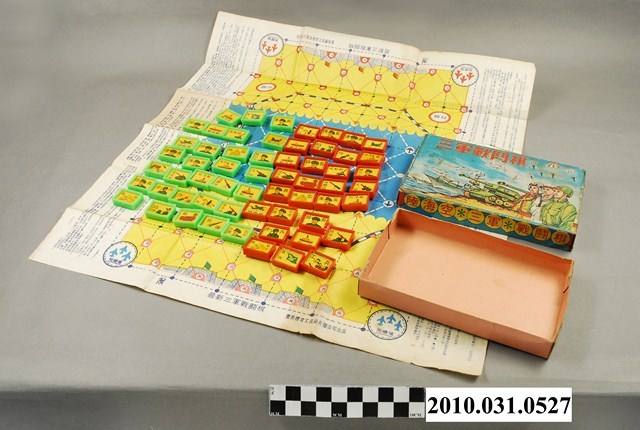 1.本物件為雷鳥體育文具廠有限公司出品之三軍戰鬥棋遊戲,內容物包含三軍戰鬥棋外盒、戰鬥棋棋圖、紅色戰鬥棋29個與綠色戰鬥棋30個,紅色戰鬥棋缺少一個棋子。 2.三軍棋可供三人遊玩,其中兩人各為一方,一人擔任裁判勝負,雙方有軍旗、總司令、司長等階級棋子,兩色共計60子。遊戲過程棋子相遇,上級勝下級,各路線每次僅可走一步,總司令如被攻破需翻開軍旗。
