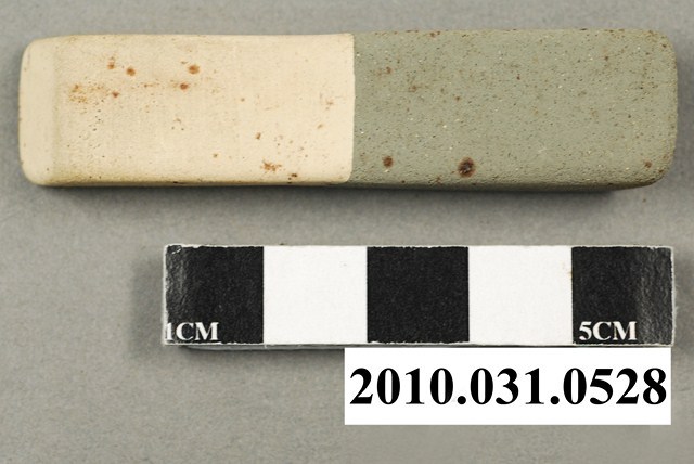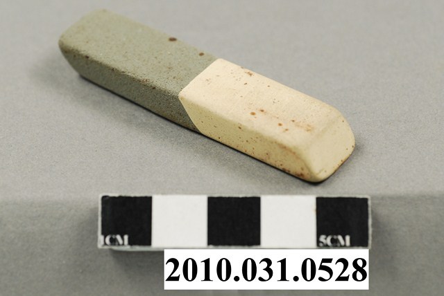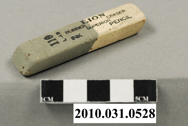 本文物為長型原子筆擦。原子筆擦兩頭皆為斜面,一半為水泥洋灰色,另一半為米白色。水泥洋灰色部分上面印有RUBBER、INK等字樣,意指可擦拭原子筆墨水的橡膠,米白色部分上面印有ERASER、PENCIL等字樣,意指可擦拭鉛筆痕跡的橡皮擦。兩色交界部分則印有LION、SUPERIOR字樣,LION應為品牌名稱。僅有一面有以上字樣。