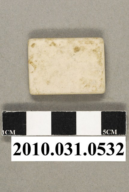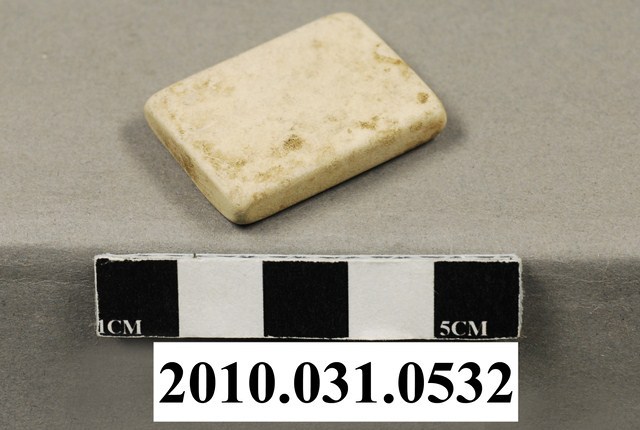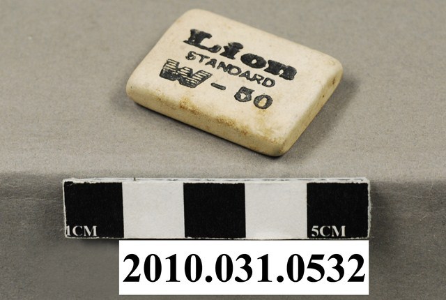 本文物為方形橡皮擦。橡皮擦為米白色,扁形,僅有一表面有字樣,字樣為Lion、STANDARD、W-50,黑色字體。Lion應為品牌名稱。