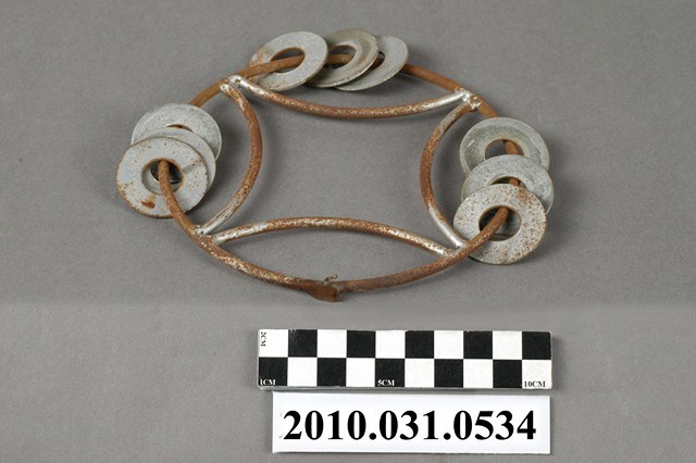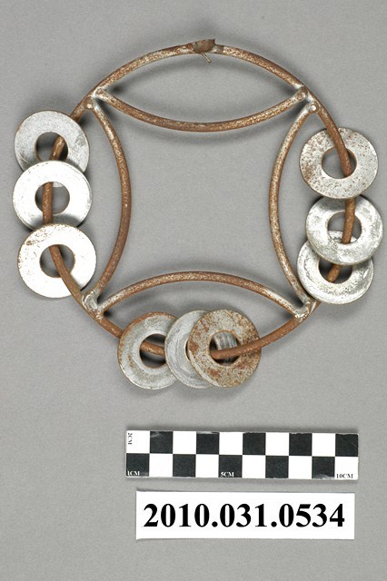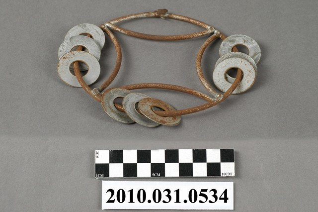 1.本物件為趕鳥拍部分物件,金屬材質。該物件外觀主要為1個金屬製空心圓環,圓環內部平均設有4條金屬線。圓環3側各設有3個空心金屬環,共有9個金屬環。整體外觀有鏽蝕痕跡。
