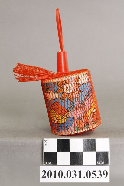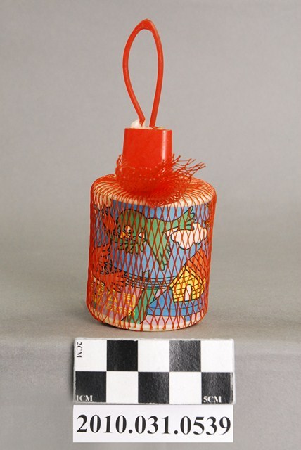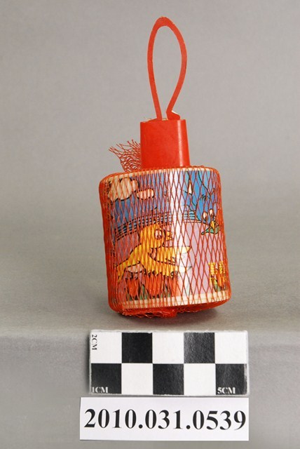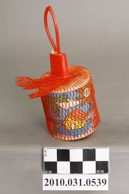 本物件為轉響器,複合材質。該物件以紅色塑膠網袋套起,物件外觀可見鳥類、太陽、白雲、房屋、花朵的插畫圖示以及「荃銘企業有限公司」字樣。