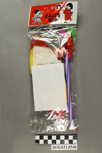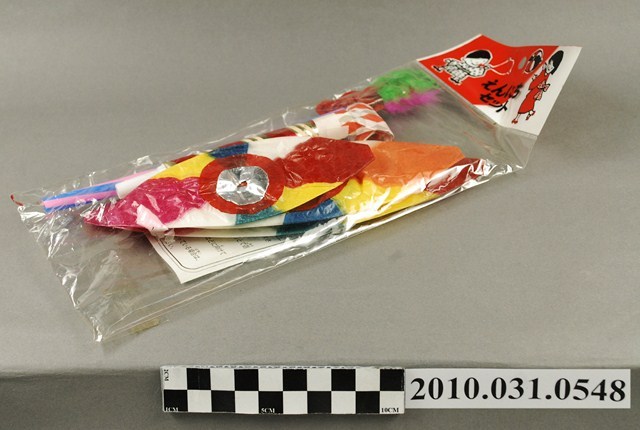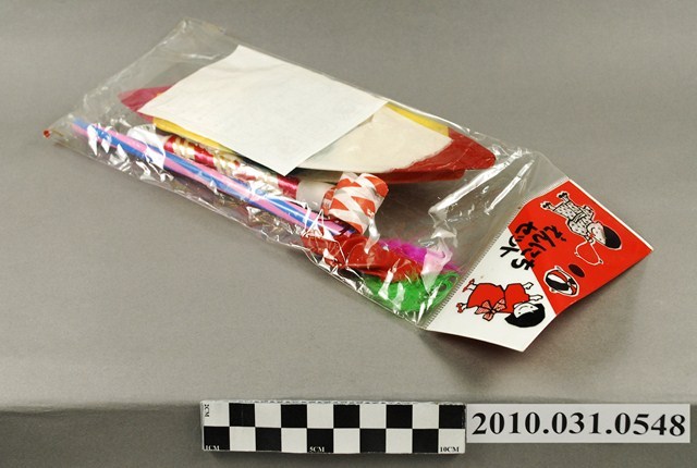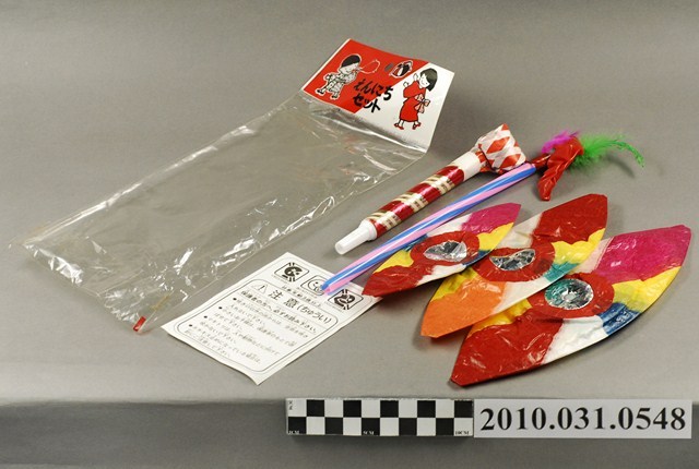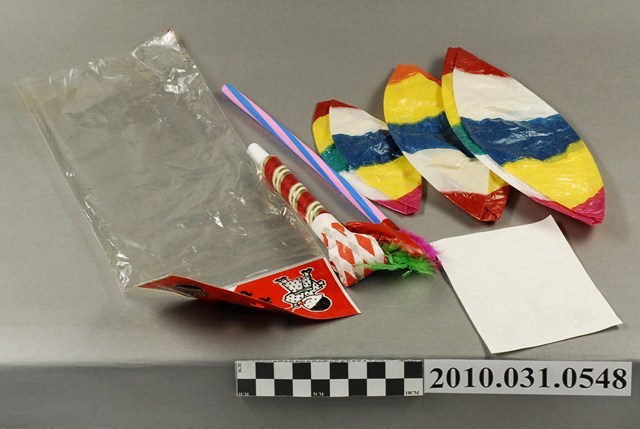 本物件為吹捲,複合材質。該物件為一袋吹捲玩具,內含兩個吹捲、三個橄欖球狀平面物體。其一吹捲的外觀為紅色、金色裝飾纏繞、另一吹捲的外觀為粉、藍色相間之吸管,尾端以粉、綠、紅色羽毛裝飾。平面物體之色彩繽紛,包括紅、黃、橘、白、藍色。
