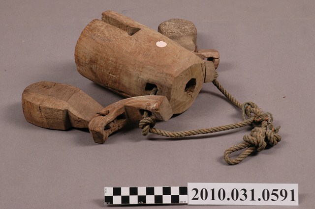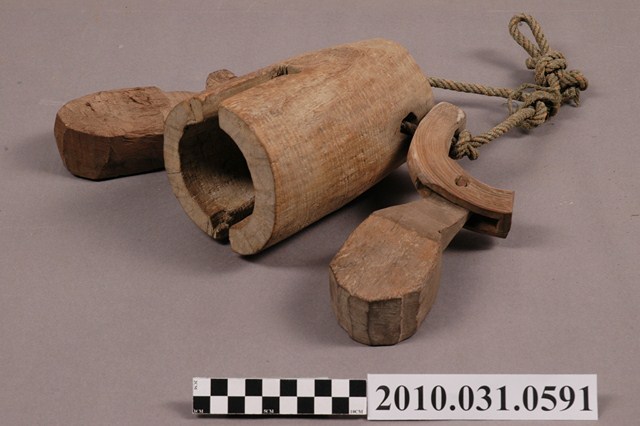 1.本物件為牛鈴,木頭材質。該物件外觀可見1條細繩,細繩下方兩端固定於3個木製物件,左右兩側為活動式設計的木製短棍,中間為圓筒狀的中空木製物件。整體外觀有使用痕跡。