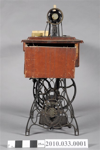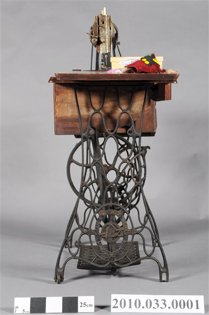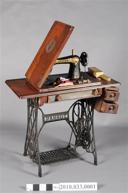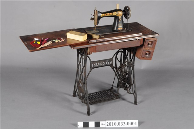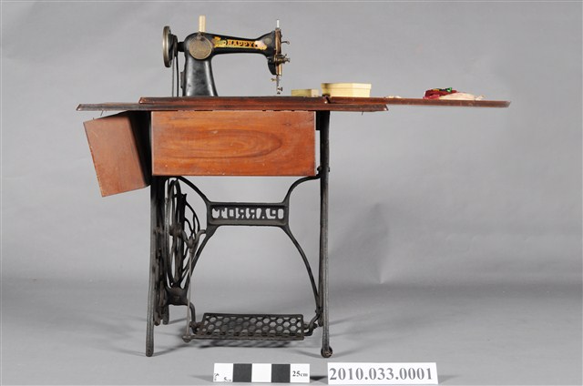 本文物為快樂牌腳踏式裁縫車組,機身為金屬材質,附木質工作收納桌、金屬腳踏板。縫紉機之功能正常,惟下方收納抽屜略有脫落損壞,需進行加固修復。 該文物為約50餘歲的捐贈者陳霖,其母親以前常使用之縫紉工具。1790年英國人湯瑪斯‧聖特(Thomas Saint)為提高製鞋效率設計手搖裁縫機,在多次的改良之下,時至1853年多數家庭使用之腳踏裁縫機才出現。而傳統家庭中的縫紉工作多由女性擔任,因此縫紉機出現反映女性生活與科技互動,所產生工作型態之改變。
