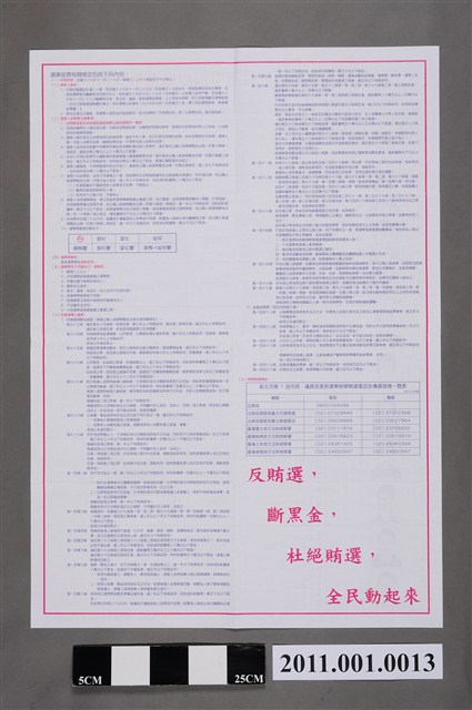 此物件標題為「新北市第1屆里長選舉板橋區選舉公報 」,投票日期為2010年11月27日,編印單位為新北市選舉委員會。此公報羅列候選人名單及其學經歷、政見,以及投票地點、投票規範。 2010年11月27日舉辦的中華民國直轄市市長暨市議員選舉、中華民國直轄市里長選舉,實施範圍包含當時新形成的5個直轄市:臺北市、新北市、臺中市、臺南市及高雄市。是次選舉,對於臺北市之外的其餘四者而言,皆為改制或區域合併後的首次地方公職選舉,大眾媒體普遍以「五都選舉」稱之,此次五都選舉的結果為:臺北市:郝龍斌、新北市:朱立倫、臺中市:胡志強、臺南市:賴清德、高雄市:陳菊,其中臺北、新北、臺中市長由中國國民黨取得,臺南、高雄市長由民主進步黨取得。 臺灣的村里長選舉,始於1946年,第1、2屆的村里長選舉依據「臺灣省各縣市村里長選舉辦法」,並無候選人制度,且由村里民大會舉辦。在1950年起設置候選人登記制度,選舉投票場所也由村里民大會決定改為專設的投票所。里長的任期,自第4屆起由2年改為3年,而後因應各行政區劃發展狀況而有部分地區調整為4年。後於第7屆起,里長任期均改為4年。