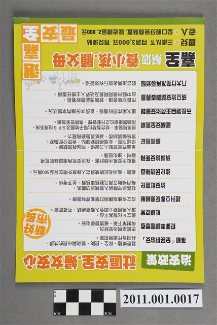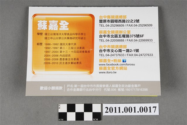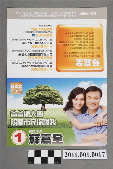 此物件為選舉廣告,為蘇嘉全於2010年參選臺中市市長時所印製。廣告主旨為「爸爸像大樹 照顧市民照顧我」,正面以蘇嘉全與其女兒之合照為主軸,背面刊載其學經歷與競選工作相關資訊。 本件所提及的候選人蘇嘉全,出身屏東縣,曾任立法委員、國大代表、屏東縣縣長、內政部長。2010年,時任民進黨秘書長的蘇嘉全,受徵召參選臺中市市長,而後落敗於競選連任的胡志強。蘇嘉全於2012年亦曾由民進黨提名為副總統候選人,但並未順利當選。2016年,蘇嘉全以民進黨不分區立委的身份,當選為第九屆立法院院長。 2010年11月27日舉辦的中華民國直轄市市長暨市議員選舉、中華民國直轄市里長選舉,實施範圍包含當時新形成的5個直轄市:臺北市、新北市、臺中市、臺南市及高雄市。是次選舉,對於臺北市之外的其餘四者而言,皆為改制或區域合併後的首次地方公職選舉,大眾媒體普遍以「五都選舉」稱之,此次五都選舉的結果為:臺北市:郝龍斌、新北市:朱立倫、臺中市:胡志強、臺南市:賴清德、高雄市:陳菊,其中臺北、新北、臺中市長由中國國民黨取得,臺南、高雄市長由民主進步黨取得。