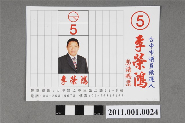 此物件為選舉廣告,為李榮鴻於2010年參選臺中市議員時所印製。廣告主旨為「就業 競爭力 幸福下一代」,正面為李榮鴻拜票形象照,背面為選票圈選示意圖。 本件所提及的候選人李榮鴻為臺中市大甲區政治人物,曾代表中國國民黨擔任多屆臺中縣、市議員,亦在商業、文教、運輸等領域參與地方民間組織的運作。 2010年11月27日舉辦的中華民國直轄市市長暨市議員選舉、中華民國直轄市里長選舉,實施範圍包含當時新形成的5個直轄市:臺北市、新北市、臺中市、臺南市及高雄市。是次選舉,對於臺北市之外的其餘四者而言,皆為改制或區域合併後的首次地方公職選舉,大眾媒體普遍以「五都選舉」稱之,此次五都選舉的結果為:臺北市:郝龍斌、新北市:朱立倫、臺中市:胡志強、臺南市:賴清德、高雄市:陳菊,其中臺北、新北、臺中市長由中國國民黨取得,臺南、高雄市長由民主進步黨取得。