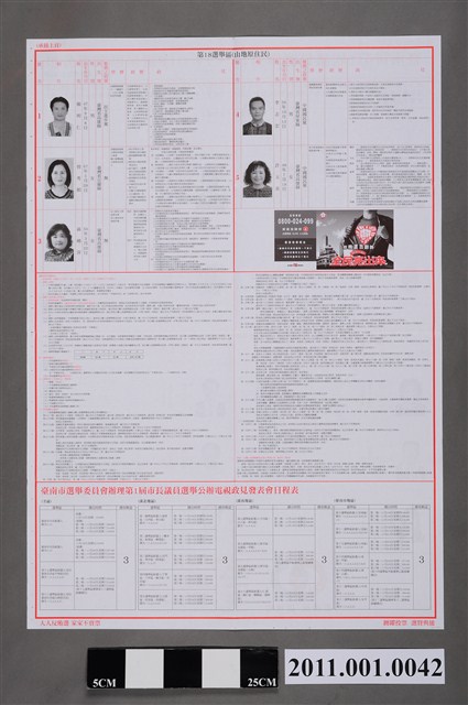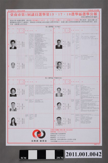 此物件標題為「臺南市第1屆議員選舉第13、17、18選區選舉公報」(第2選區),投票日期為2010年11月27日,編印單位為臺南市選舉委員會,此公報羅列候選人名單及其學經歷、政見,以及投票地點、投票規範。 2010年11月27日舉辦的中華民國直轄市市長暨市議員選舉、中華民國直轄市里長選舉,實施範圍包含當時新形成的5個直轄市:臺北市、新北市、臺中市、臺南市及高雄市。是次選舉,對於臺北市之外的其餘四者而言,皆為改制或區域合併後的首次地方公職選舉,大眾媒體普遍以「五都選舉」稱之,此次五都選舉的結果為:臺北市:郝龍斌、新北市:朱立倫、臺中市:胡志強、臺南市:賴清德、高雄市:陳菊,其中臺北、新北、臺中市長由中國國民黨取得,臺南、高雄市長由民主進步黨取得。 臺灣的縣市議員選舉始於日治時代,在1935年6月臺灣總督府發佈《市會議員及街庄協議會員選舉規程》後,在該年的11月22日舉行全臺第一次地方民意代表選舉,此次選舉,選出的民意代表官選、民選各半,而選出來之議員僅具議決權,不具有提案、質詢等權責。後在國民黨政府派員接收臺灣後,1945年臺灣行政長官公署公布「臺灣省各級民意機關成立方案」,並於1946年辦理間接選舉產生縣市參議員。而在1950年,舉辦了第1屆民選的縣市議員選舉,臺灣民眾得以選出為自身權益喉舌的議員。