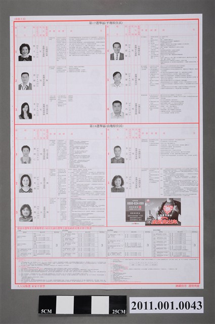 此物件標題為「臺南市第1屆議員選舉第14、17、18選區選舉公報」(第2選區),投票日期為2010年11月27日,編印單位為臺南市選舉委員會,此公報羅列候選人名單及其學經歷、政見,以及投票地點、投票規範。 2010年11月27日舉辦的中華民國直轄市市長暨市議員選舉、中華民國直轄市里長選舉,實施範圍包含當時新形成的5個直轄市:臺北市、新北市、臺中市、臺南市及高雄市。是次選舉,對於臺北市之外的其餘四者而言,皆為改制或區域合併後的首次地方公職選舉,大眾媒體普遍以「五都選舉」稱之,此次五都選舉的結果為:臺北市:郝龍斌、新北市:朱立倫、臺中市:胡志強、臺南市:賴清德、高雄市:陳菊,其中臺北、新北、臺中市長由中國國民黨取得,臺南、高雄市長由民主進步黨取得。 臺灣的縣市議員選舉始於日治時代,在1935年6月臺灣總督府發佈《市會議員及街庄協議會員選舉規程》後,在該年的11月22日舉行全臺第一次地方民意代表選舉,此次選舉,選出的民意代表官選、民選各半,而選出來之議員僅具議決權,不具有提案、質詢等權責。後在國民黨政府派員接收臺灣後,1945年臺灣行政長官公署公布「臺灣省各級民意機關成立方案」,並於1946年辦理間接選舉產生縣市參議員。而在1950年,舉辦了第1屆民選的縣市議員選舉,臺灣民眾得以選出為自身權益喉舌的議員。