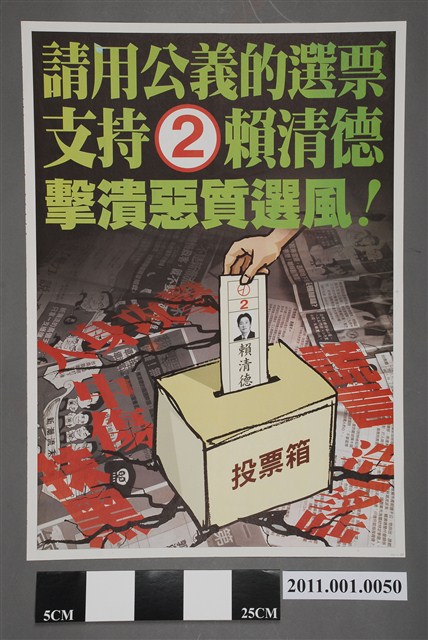 此物件為選舉廣告,為賴清德於2010年參選臺南市市長時所印製。廣告主旨為「請用公義的選票 支持2號賴清德 擊潰惡質選風!」,廣告主旨在訴求動員支持,鞏固投票率。 本件所提及的候選人賴清德,為醫師出身,曾任國大代表、立法委員、臺南市長。2010年,賴清德由民進黨提名參選臺南市長,順利當選並於次屆連任成功。 2010年11月27日舉辦的中華民國直轄市市長暨市議員選舉、中華民國直轄市里長選舉,實施範圍包含當時新形成的5個直轄市:臺北市、新北市、臺中市、臺南市及高雄市。是次選舉,對於臺北市之外的其餘四者而言,皆為改制或區域合併後的首次地方公職選舉,大眾媒體普遍以「五都選舉」稱之,此次五都選舉的結果為:臺北市:郝龍斌、新北市:朱立倫、臺中市:胡志強、臺南市:賴清德、高雄市:陳菊,其中臺北、新北、臺中市長由中國國民黨取得,臺南、高雄市長由民主進步黨取得。