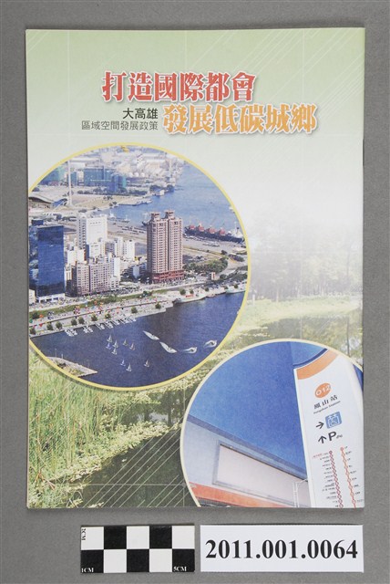 此物件為政治文宣,標題為「打造國際都會 發展低碳城鄉 大高雄區域空間發展政策」,發行人為楊秋興,發行日期為2010年11月。此文宣為一小冊,紀錄楊秋興對於高雄市政之見解。 本件所提及的候選人楊秋興,出身高雄,曾任臺灣省議員、立法委員、高雄縣長。楊秋興於2001年由民進黨提名參選高雄縣長,順利當選並連任成功。2010年,因應縣市合併案,高雄縣、市將合併為「高雄市」,在民進黨確定提名時任高雄市長陳菊參選該年年底的地方首長選舉後,楊秋興決定脫黨參選,以無黨籍身份與陳菊、黃昭順競爭,卻未能順利當選。2014年,楊秋興由中國國民黨提名參選高雄市長,但仍敗給尋求市長連任的陳菊。 2010年11月27日舉辦的中華民國直轄市市長暨市議員選舉、中華民國直轄市里長選舉,實施範圍包含當時新形成的5個直轄市:臺北市、新北市、臺中市、臺南市及高雄市。是次選舉,對於臺北市之外的其餘四者而言,皆為改制或區域合併後的首次地方公職選舉,大眾媒體普遍以「五都選舉」稱之,此次五都選舉的結果為:臺北市:郝龍斌、新北市:朱立倫、臺中市:胡志強、臺南市:賴清德、高雄市:陳菊,其中臺北、新北、臺中市長由中國國民黨取得,臺南、高雄市長由民主進步黨取得。