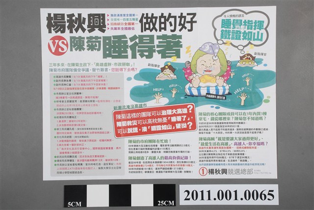 此物件為選舉文宣,主旨為「秋菊對決•超級比一比」,為楊秋興於2010年競選高雄市長候選人時所印製,透過候選人於地方政府執政事蹟的對比,凸顯人格特質。 本件所提及的候選人楊秋興,出身高雄,曾任臺灣省議員、立法委員、高雄縣長。楊秋興於2001年由民進黨提名參選高雄縣長,順利當選並連任成功。2010年,因應縣市合併案,高雄縣、市將合併為「高雄市」,在民進黨確定提名時任高雄市長陳菊參選該年年底的地方首長選舉後,楊秋興決定脫黨參選,以無黨籍身份與陳菊、黃昭順競爭,卻未能順利當選。2014年,楊秋興由中國國民黨提名參選高雄市長,但仍敗給尋求市長連任的陳菊。 2010年11月27日舉辦的中華民國直轄市市長暨市議員選舉、中華民國直轄市里長選舉,實施範圍包含當時新形成的5個直轄市:臺北市、新北市、臺中市、臺南市及高雄市。是次選舉,對於臺北市之外的其餘四者而言,皆為改制或區域合併後的首次地方公職選舉,大眾媒體普遍以「五都選舉」稱之,此次五都選舉的結果為:臺北市:郝龍斌、新北市:朱立倫、臺中市:胡志強、臺南市:賴清德、高雄市:陳菊,其中臺北、新北、臺中市長由中國國民黨取得,臺南、高雄市長由民主進步黨取得。