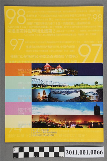此物件為政治文宣,標題為「更新 創見 大高雄治理的五顆星政綱 」,發行人為楊秋興,發行日期為2010年10月。此文宣為一小冊,紀錄楊秋興對於高雄市市政之見解。 本件所提及的候選人楊秋興,出身高雄,曾任臺灣省議員、立法委員、高雄縣長。楊秋興於2001年由民進黨提名參選高雄縣長,順利當選並連任成功。2010年,因應縣市合併案,高雄縣、市將合併為「高雄市」,在民進黨確定提名時任高雄市長陳菊參選該年年底的地方首長選舉後,楊秋興決定脫黨參選,以無黨籍身份與陳菊、黃昭順競爭,卻未能順利當選。2014年,楊秋興由中國國民黨提名參選高雄市長,但仍敗給尋求市長連任的陳菊。 2010年11月27日舉辦的中華民國直轄市市長暨市議員選舉、中華民國直轄市里長選舉,實施範圍包含當時新形成的5個直轄市:臺北市、新北市、臺中市、臺南市及高雄市。是次選舉,對於臺北市之外的其餘四者而言,皆為改制或區域合併後的首次地方公職選舉,大眾媒體普遍以「五都選舉」稱之,此次五都選舉的結果為:臺北市:郝龍斌、新北市:朱立倫、臺中市:胡志強、臺南市:賴清德、高雄市:陳菊,其中臺北、新北、臺中市長由中國國民黨取得,臺南、高雄市長由民主進步黨取得。