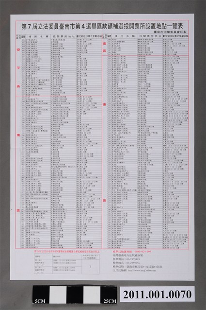 此物件標題為「第7屆立法委員臺南市第4選舉區缺額補選選舉公報」,投票日期為2011年3月5日,編印單位為臺南市選舉委員會,此公報羅列候選人名單及其學經歷、政見。 2011年3月5日舉行的「第7屆立法委員臺南市第4選舉區缺額補選選舉」,是因應該選區原任第七屆立委賴清德,於2010年參選臺南市市長並當選後,依法須辭去立委職務所產生的空缺而舉辦。是次選舉由民進黨提名的許添財當選。 臺灣的立法委員選舉始於1948年,尚領有部分中國領土的中華民國政府以全國各省、直轄市,以及邊疆民族、僑民、職業團體為範疇舉行選舉。1949年中央政府遷臺,自中國大陸各省隨附來台的立法委員,依「司法院大法官會議釋字第31號解釋」得以無限期延任。1969年,中華民國政府發佈《動員戡亂時期自由地區中央公職人員增選補選辦法》展開立法委員的增補選,此後每屆選舉之競爭益加激烈,甚至於1977年爆發「中壢事件」。最後,經歷1991年的憲法增修,政府得以正式展開「中央民意代表全面改選」,並於1992年舉辦了第二屆立法委員選舉。
