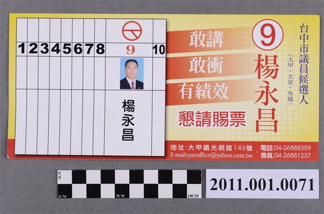 此物件為選舉廣告,為楊永昌於2010年參選臺中市議員時所印製。廣告主旨為「選!就要選給會做的!會做的!要繼續乎做!」,正、反兩面以刊載報紙縮圖的形式展示楊永昌問政事蹟。 本件所提及的候選人楊永昌曾任大甲鎮民代表、臺中縣議員,2010年以無黨籍身份當選臺中市議員。楊永昌於2014年競選連任成功,但因賄選遭判當選無效。 2010年11月27日舉辦的中華民國直轄市市長暨市議員選舉、中華民國直轄市里長選舉,實施範圍包含當時新形成的5個直轄市:臺北市、新北市、臺中市、臺南市及高雄市。是次選舉,對於臺北市之外的其餘四者而言,皆為改制或區域合併後的首次地方公職選舉,大眾媒體普遍以「五都選舉」稱之,此次五都選舉的結果為:臺北市:郝龍斌、新北市:朱立倫、臺中市:胡志強、臺南市:賴清德、高雄市:陳菊,其中臺北、新北、臺中市長由中國國民黨取得,臺南、高雄市長由民主進步黨取得。