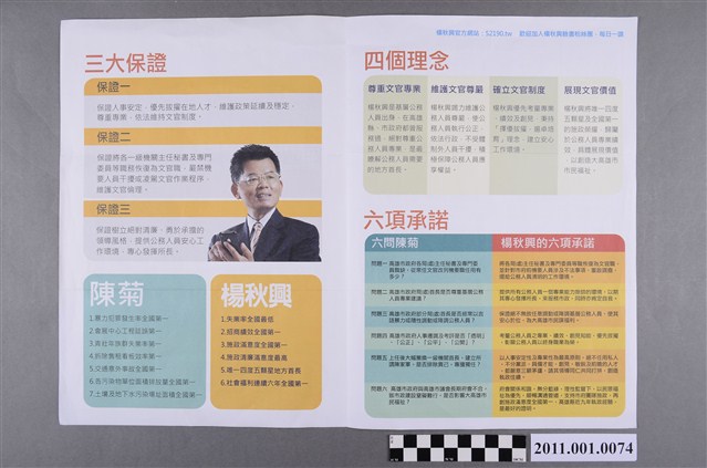 此物件為政治文宣,標題為「更新 創見 大高雄治理的五顆星政綱 」,發行人為楊秋興,發行日期為2010年10月。此文宣為一小冊,紀錄楊秋興對於高雄市政之見解。 本件所提及的候選人楊秋興,出身高雄,曾任臺灣省議員、立法委員、高雄縣長。楊秋興於2001年由民進黨提名參選高雄縣長,順利當選並連任成功。2010年,因應縣市合併案,高雄縣、市將合併為「高雄市」,在民進黨確定提名時任高雄市長陳菊參選該年年底的地方首長選舉後,楊秋興決定脫黨參選,以無黨籍身份與陳菊、黃昭順競爭,卻未能順利當選。2014年,楊秋興由中國國民黨提名參選高雄市長,但仍敗給尋求市長連任的陳菊。 2010年11月27日舉辦的中華民國直轄市市長暨市議員選舉、中華民國直轄市里長選舉,實施範圍包含當時新形成的5個直轄市:臺北市、新北市、臺中市、臺南市及高雄市。是次選舉,對於臺北市之外的其餘四者而言,皆為改制或區域合併後的首次地方公職選舉,大眾媒體普遍以「五都選舉」稱之,此次五都選舉的結果為:臺北市:郝龍斌、新北市:朱立倫、臺中市:胡志強、臺南市:賴清德、高雄市:陳菊,其中臺北、新北、臺中市長由中國國民黨取得,臺南、高雄市長由民主進步黨取得。