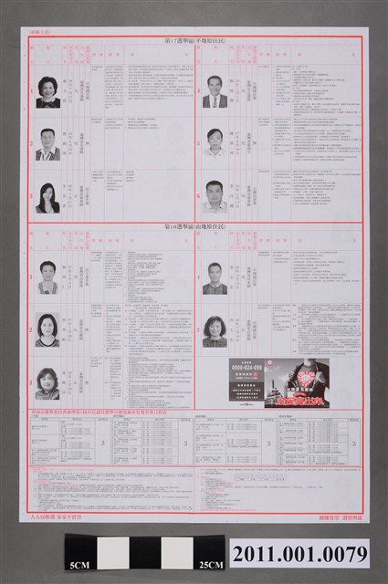 此物件標題為「臺南市第1屆議員選舉第14、17、18選區選舉公報」(第2選區),投票日期為2010年11月27日,編印單位為臺南市選舉委員會,此公報羅列候選人名單及其學經歷、政見,以及投票地點、投票規範。 2010年11月27日舉辦的中華民國直轄市市長暨市議員選舉、中華民國直轄市里長選舉,實施範圍包含當時新形成的5個直轄市:臺北市、新北市、臺中市、臺南市及高雄市。是次選舉,對於臺北市之外的其餘四者而言,皆為改制或區域合併後的首次地方公職選舉,大眾媒體普遍以「五都選舉」稱之,此次五都選舉的結果為:臺北市:郝龍斌、新北市:朱立倫、臺中市:胡志強、臺南市:賴清德、高雄市:陳菊,其中臺北、新北、臺中市長由中國國民黨取得,臺南、高雄市長由民主進步黨取得。 臺灣的縣市議員選舉始於日治時代,在1935年6月臺灣總督府發佈《市會議員及街庄協議會員選舉規程》後,在該年的11月22日舉行全臺第一次地方民意代表選舉,此次選舉,選出的民意代表官選、民選各半,而選出來之議員僅具議決權,不具有提案、質詢等權責。後在國民黨政府派員接收臺灣後,1945年臺灣行政長官公署公布「臺灣省各級民意機關成立方案」,並於1946年辦理間接選舉產生縣市參議員。而在1950年,舉辦了第1屆民選的縣市議員選舉,臺灣民眾得以選出為自身權益喉舌的議員。