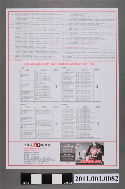 此物件標題為「臺南市第一屆市長選舉選舉公報 」,投票日期為2010年11月27日,編印單位為臺南市選舉委員會,此公報羅列候選人名單及其學經歷、政見,以及投票地點、投票規範。 2010年11月27日舉辦的中華民國直轄市市長暨市議員選舉、中華民國直轄市里長選舉,實施範圍包含當時新形成的5個直轄市:臺北市、新北市、臺中市、臺南市及高雄市。是次選舉,對於臺北市之外的其餘四者而言,皆為改制或區域合併後的首次地方公職選舉,大眾媒體普遍以「五都選舉」稱之,此次五都選舉的結果中代表民主進步黨的賴清德擊敗代表中國國民黨的郭添財當選臺南市市長,其他結果為:臺北市:郝龍斌、新北市:朱立倫、臺中市:胡志強、高雄市:陳菊。 臺灣縣市長選舉之實施始於1950年(民國39年),由時任省政府主席的吳國楨推動,依據「臺灣省各縣市實施地方自治綱要」,在1950至1951年間於臺灣省各地舉行投票。其後由於臺北市及高雄市在1967、1979年分別「升格」為院轄市,在院轄市相關選舉法規尚未制訂、頒布前,北、高兩市市長皆由官方派任。之後到1994年「直轄市自治法」正式頒布,北、高兩市市長改為民選,縣市長選舉方告完備。