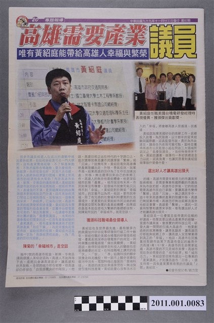 此物件為2010年11月23日發行的《很角色》週報(第82期),物件以雙面印刷,共計5張、20個版面,收錄與2010年高雄市市長、議員選舉高度相關之人物報導。 2010年11月27日舉辦的中華民國直轄市市長暨市議員選舉、中華民國直轄市里長選舉,實施範圍包含當時新形成的5個直轄市:臺北市、新北市、臺中市、臺南市及高雄市。是次選舉,對於臺北市之外的其餘四者而言,皆為改制或區域合併後的首次地方公職選舉,大眾媒體普遍以「五都選舉」稱之,此次五都選舉的結果為:臺北市:郝龍斌、新北市:朱立倫、臺中市:胡志強、臺南市:賴清德、高雄市:陳菊,其中臺北、新北、臺中市長由中國國民黨取得,臺南、高雄市長由民主進步黨取得。 《很角色》週報是以高雄地區為主的地方媒體,設刊於2007年,創立者為馬道明,刊物內容以報導政商時事,揭發內幕為主。此報刊所隸屬的鴻海時報有限公司旗下,亦設有網路媒體《很角色》時報。
