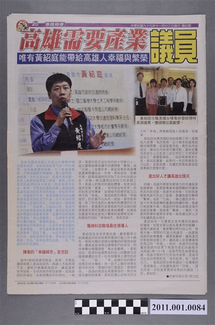 此物件為2010年11月23日發行的《很角色》週報(第82期),物件以雙面印刷,共計5張、20個版面,收錄與2010年高雄市市長、議員選舉高度相關之人物報導。 2010年11月27日舉辦的中華民國直轄市市長暨市議員選舉、中華民國直轄市里長選舉,實施範圍包含當時新形成的5個直轄市:臺北市、新北市、臺中市、臺南市及高雄市。是次選舉,對於臺北市之外的其餘四者而言,皆為改制或區域合併後的首次地方公職選舉,大眾媒體普遍以「五都選舉」稱之,此次五都選舉的結果為:臺北市:郝龍斌、新北市:朱立倫、臺中市:胡志強、臺南市:賴清德、高雄市:陳菊,其中臺北、新北、臺中市長由中國國民黨取得,臺南、高雄市長由民主進步黨取得。 《很角色》週報是以高雄地區為主的地方媒體,設刊於2007年,創立者為馬道明,刊物內容以報導政商時事,揭發內幕為主。此報刊所隸屬的鴻海時報有限公司旗下,亦設有網路媒體《很角色》時報。
